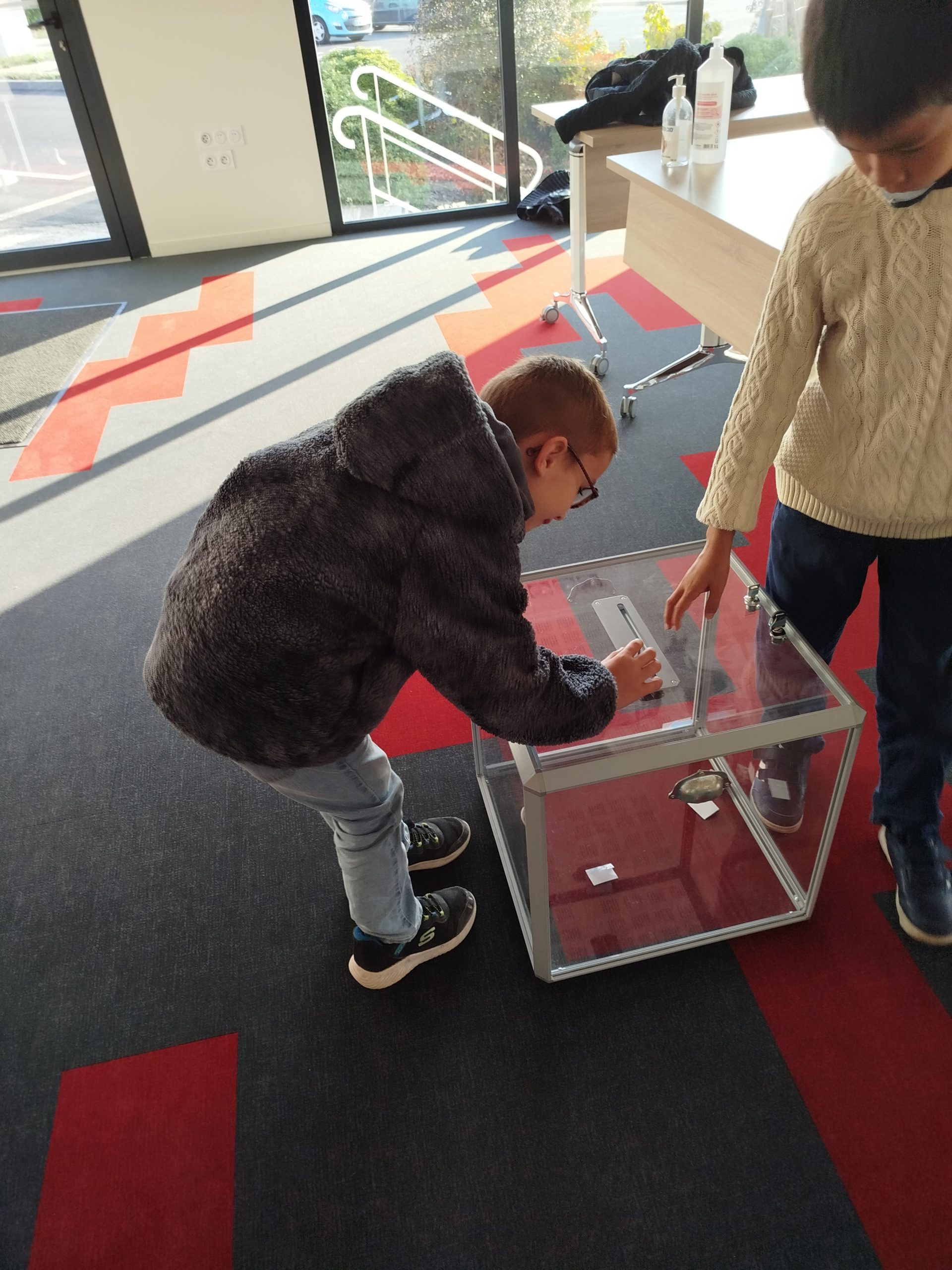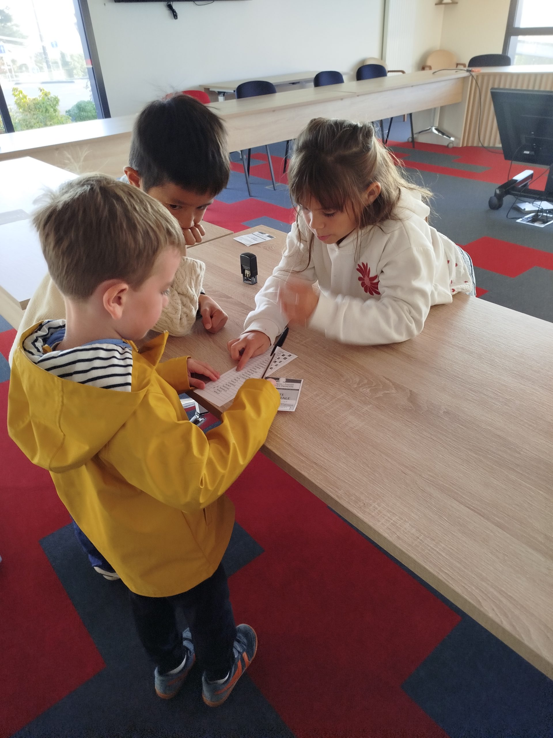 Heureusement, les CM2 étaient là, avec un élève pour ouvrir le clapet de l’urne, un autre pour regarder nos cartes d’électeurs, un autre pour nous faire signer (faire un rond face à notre prénom)