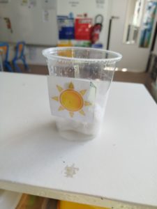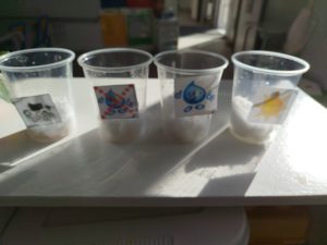 Nous avons réalisé des expériences, en lien avec la croissance d’une graine de haricot. Sur du coton, dans des pots différents, nous avons posé des graines.
