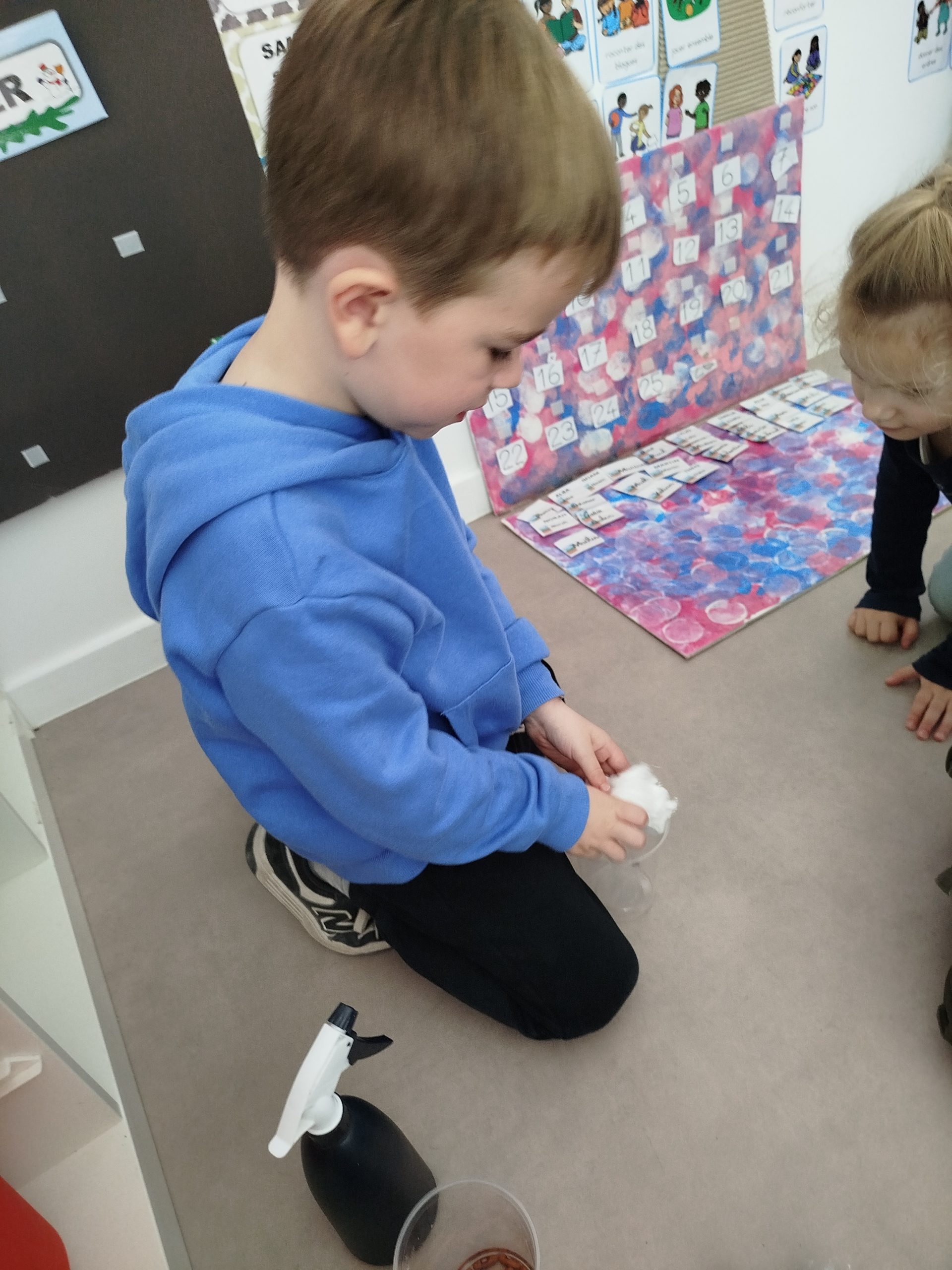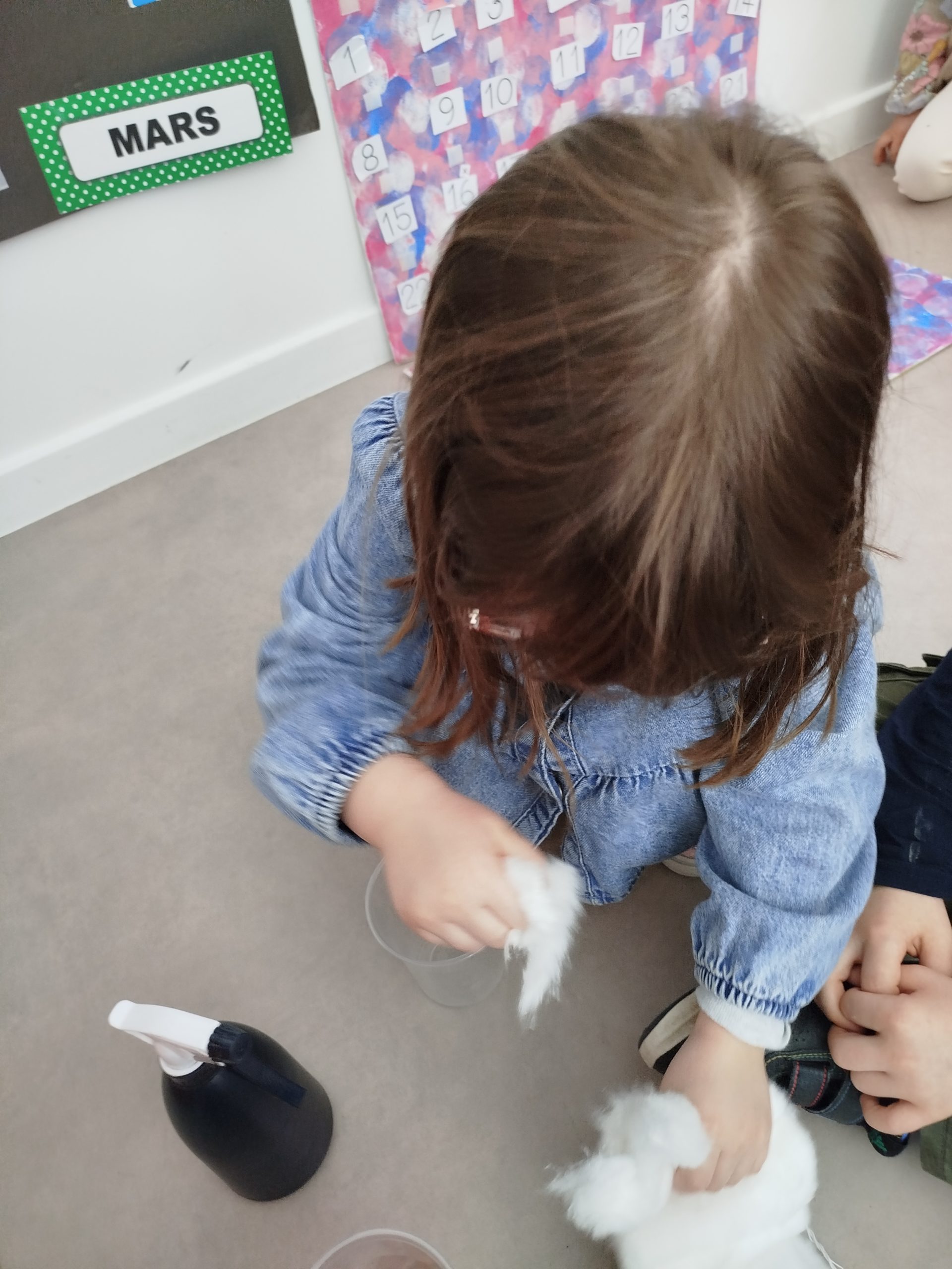 Nous avons réalisé des expériences, en lien avec la croissance d’une graine de haricot. Sur du coton, dans des pots différents, nous avons posé des graines.