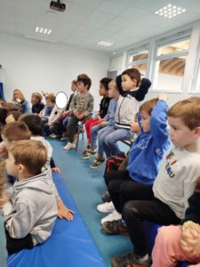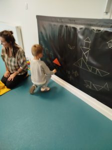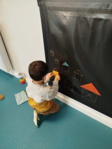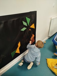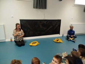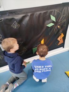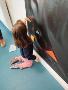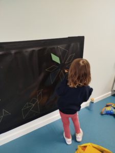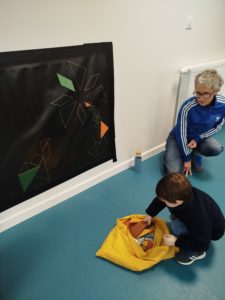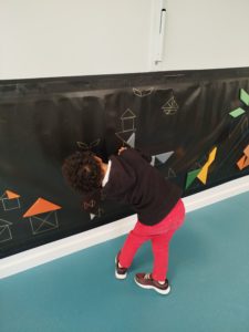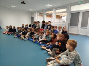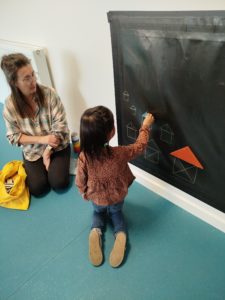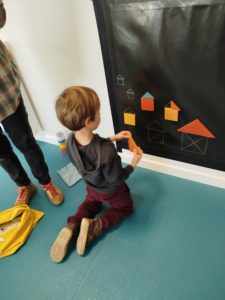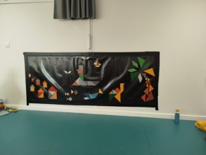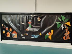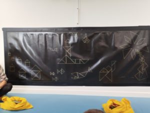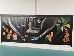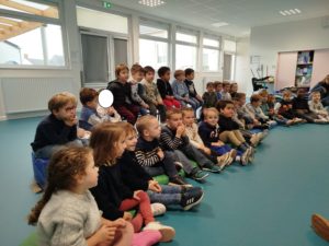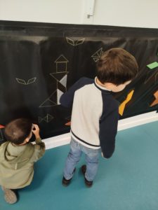 Jeudi 13 novembre, les MS et GS ont pu rencontrer deux artistes de la compagnie Boi’brut, en lien avec le spectacle “Karl” vu avant les vacances à Montrelais dans le cadre du festival “Ce soir, je sors mes parents”. Elles ont fait reformuler les grandes étapes du spectacle. Elles étaient très contentes car les élèves se souvenaient de tous les détails. Ensuite, comme Karl “personnage tangrams”, les élèves ont eu la possibilité de reconstituer une fresque, représentant les personnages de l’histoire à l’aide de morceaux de tangrams (la baleine, le phare, le palmier, les mouettes,…)
