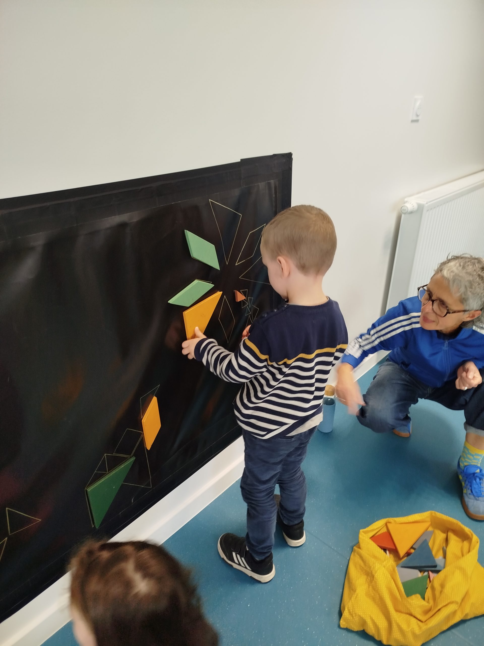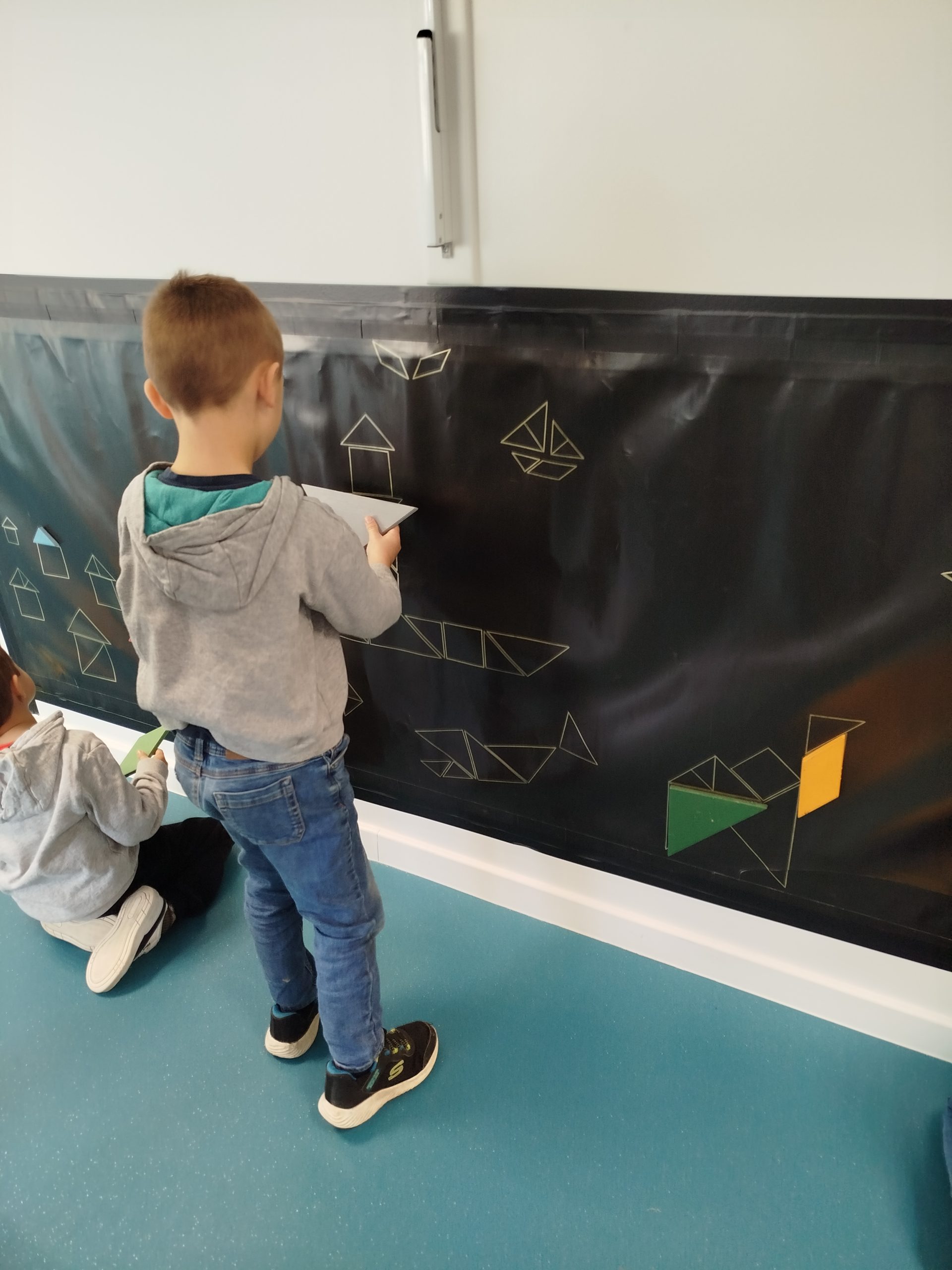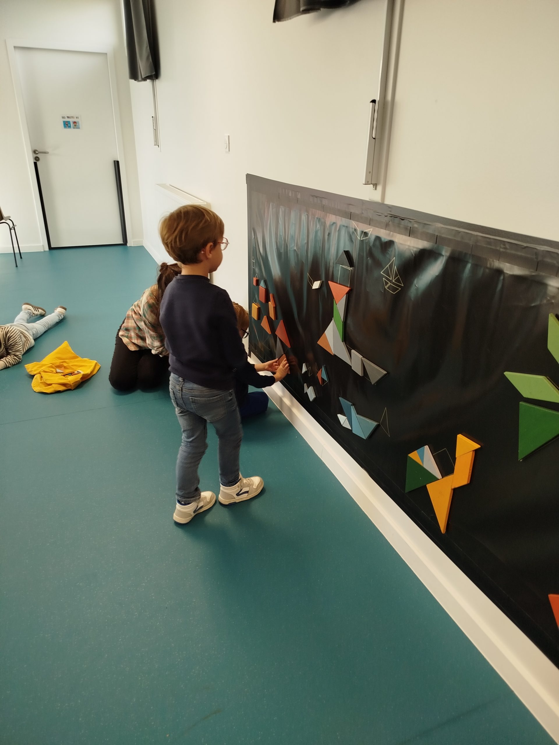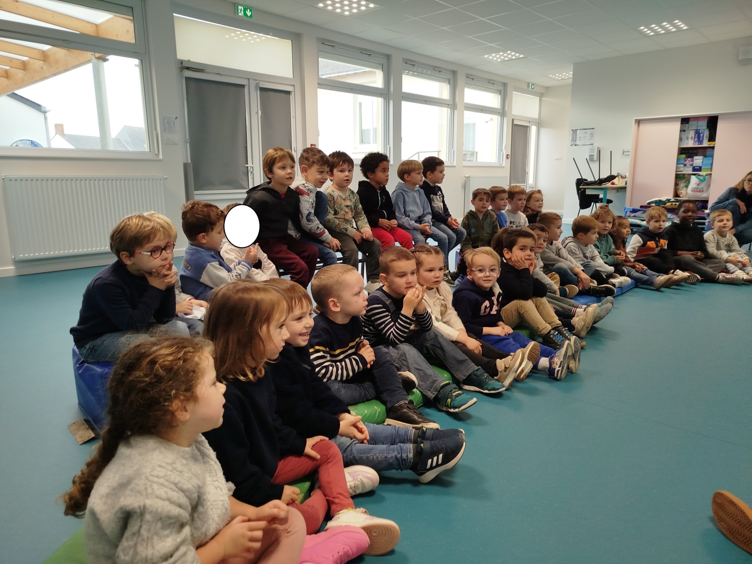 Jeudi 13 novembre, les MS et GS ont pu rencontrer deux artistes de la compagnie Boi’brut, en lien avec le spectacle “Karl” vu avant les vacances à Montrelais dans le cadre du festival “Ce soir, je sors mes parents”. Elles ont fait reformuler les grandes étapes du spectacle. Elles étaient très contentes car les élèves se souvenaient de tous les détails. Ensuite, comme Karl “personnage tangrams”, les élèves ont eu la possibilité de reconstituer une fresque, représentant les personnages de l’histoire à l’aide de morceaux de tangrams (la baleine, le phare, le palmier, les mouettes,…)