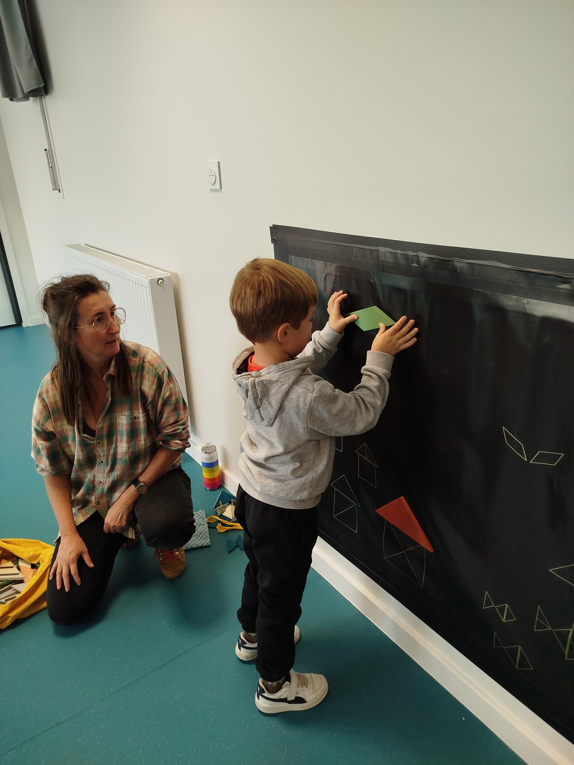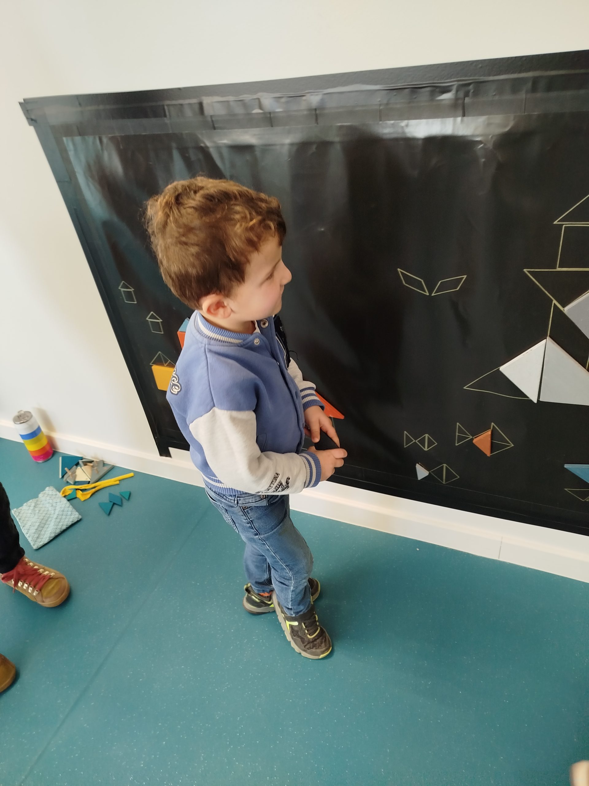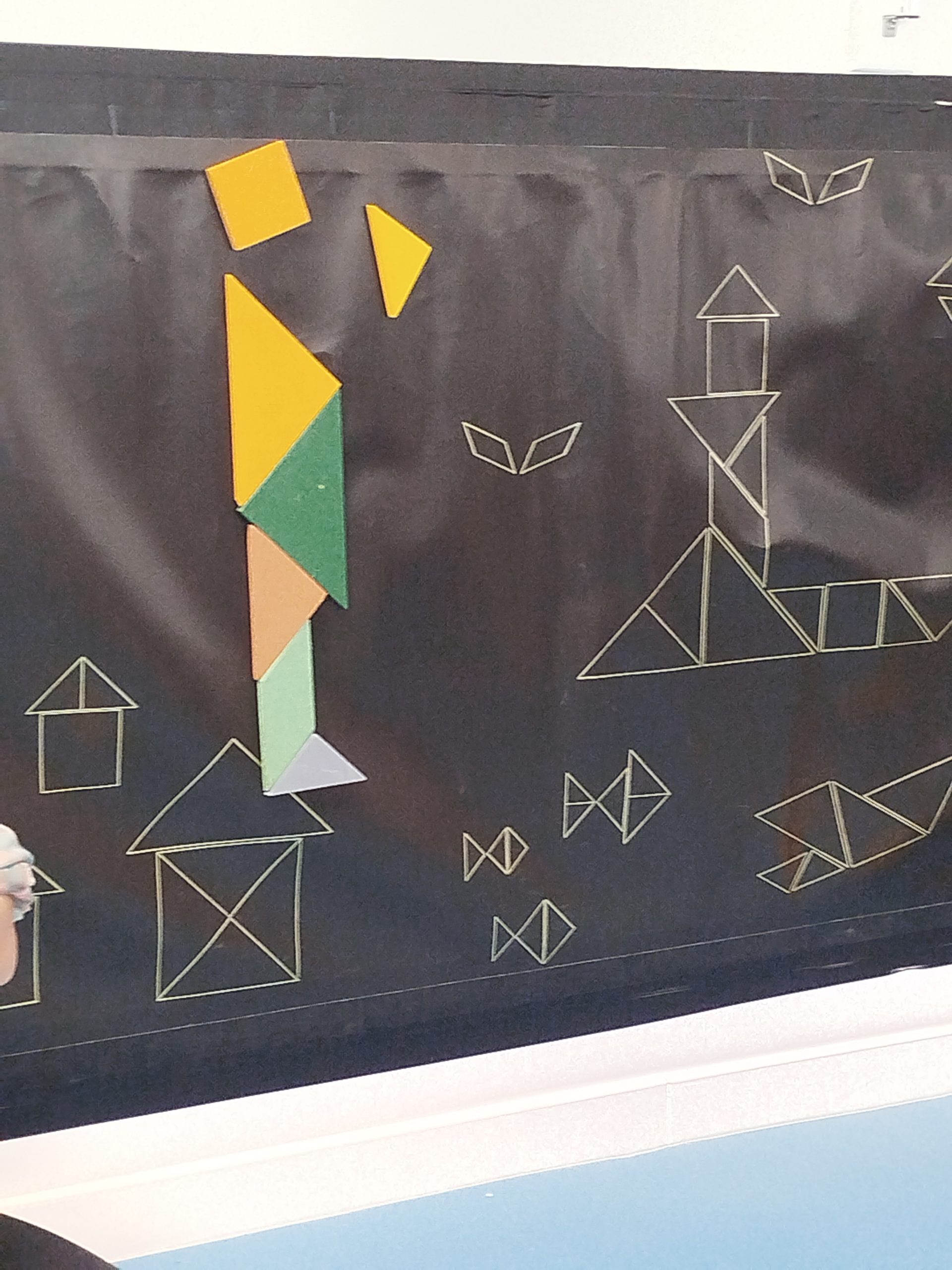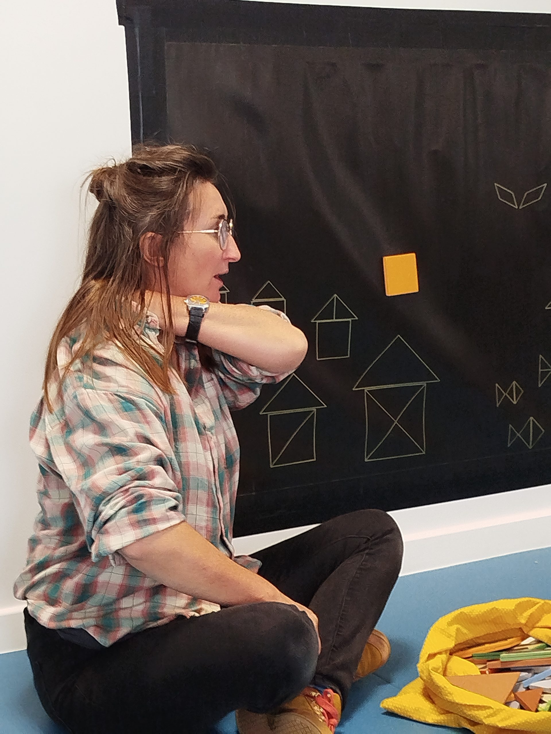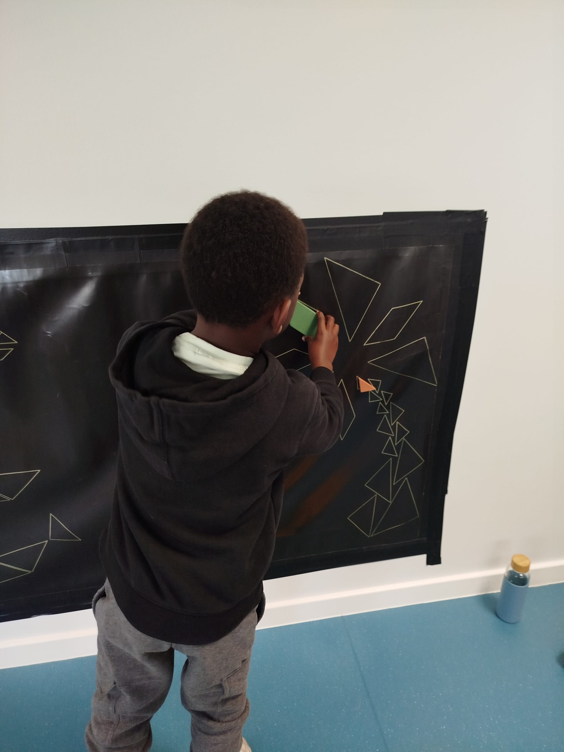 Jeudi 13 novembre, les MS et GS ont pu rencontrer deux artistes de la compagnie Boi’brut, en lien avec le spectacle “Karl” vu avant les vacances à Montrelais dans le cadre du festival “Ce soir, je sors mes parents”. Elles ont fait reformuler les grandes étapes du spectacle. Elles étaient très contentes car les élèves se souvenaient de tous les détails. Ensuite, comme Karl “personnage tangrams”, les élèves ont eu la possibilité de reconstituer une fresque, représentant les personnages de l’histoire à l’aide de morceaux de tangrams (la baleine, le phare, le palmier, les mouettes,…)