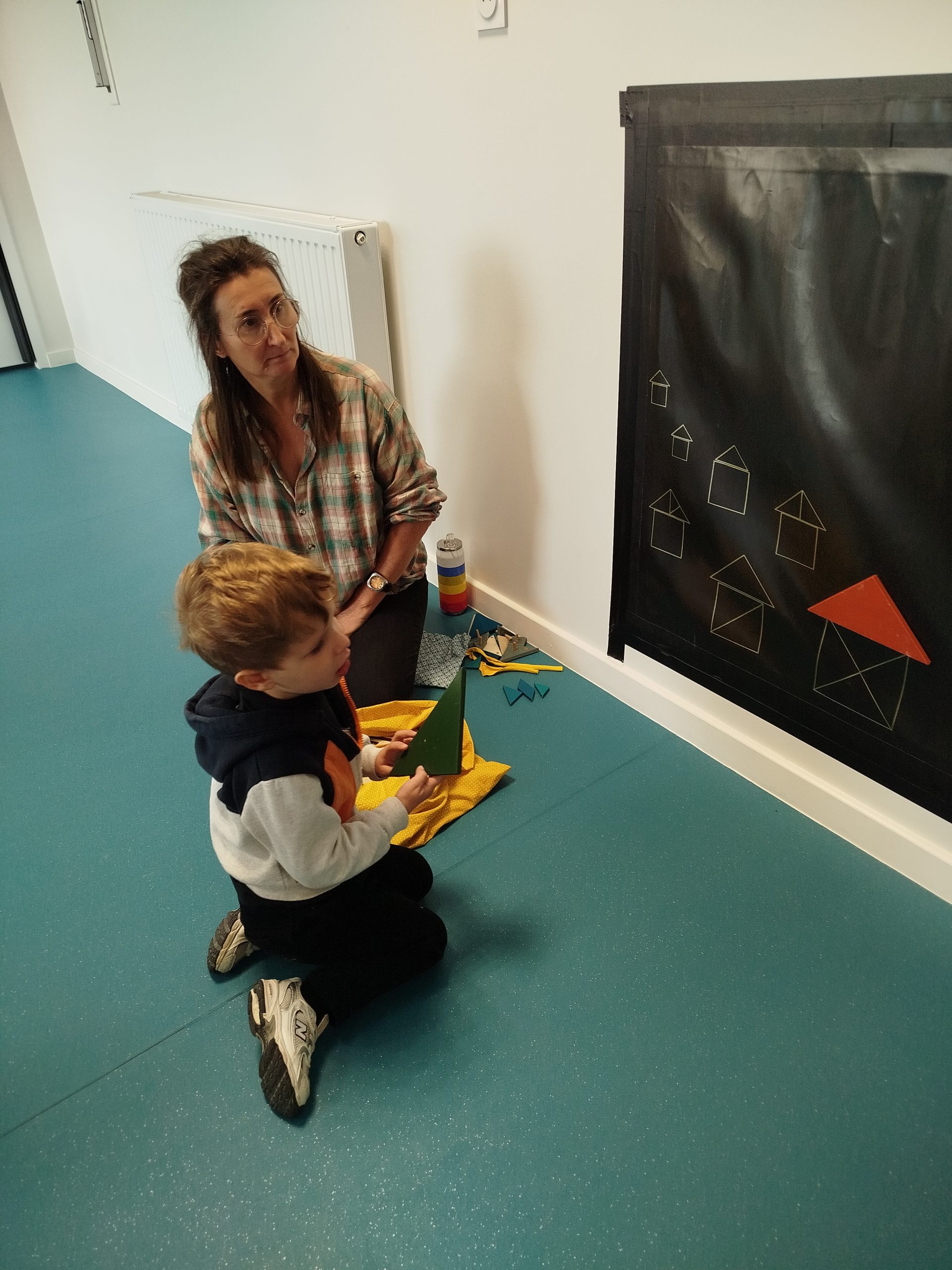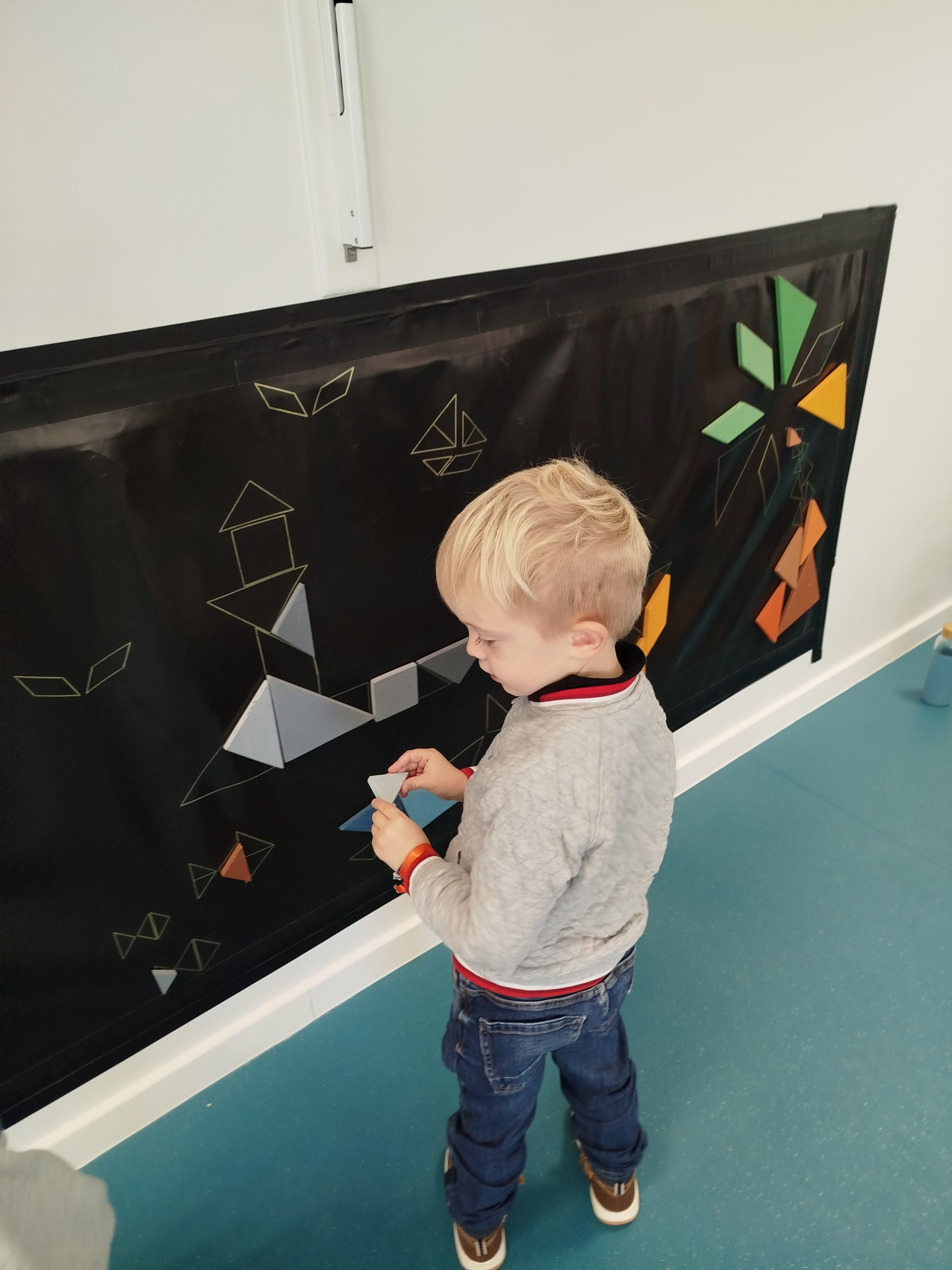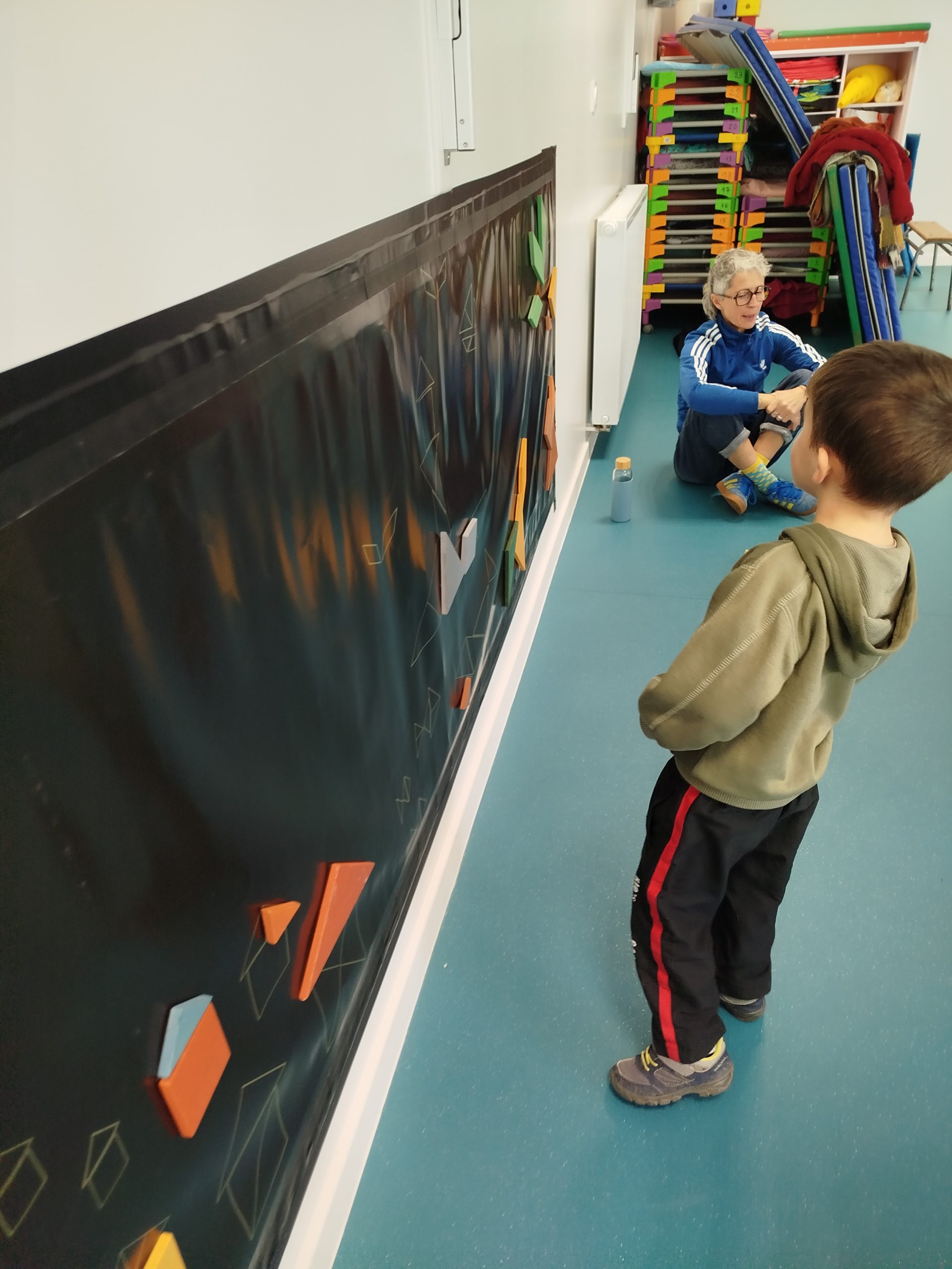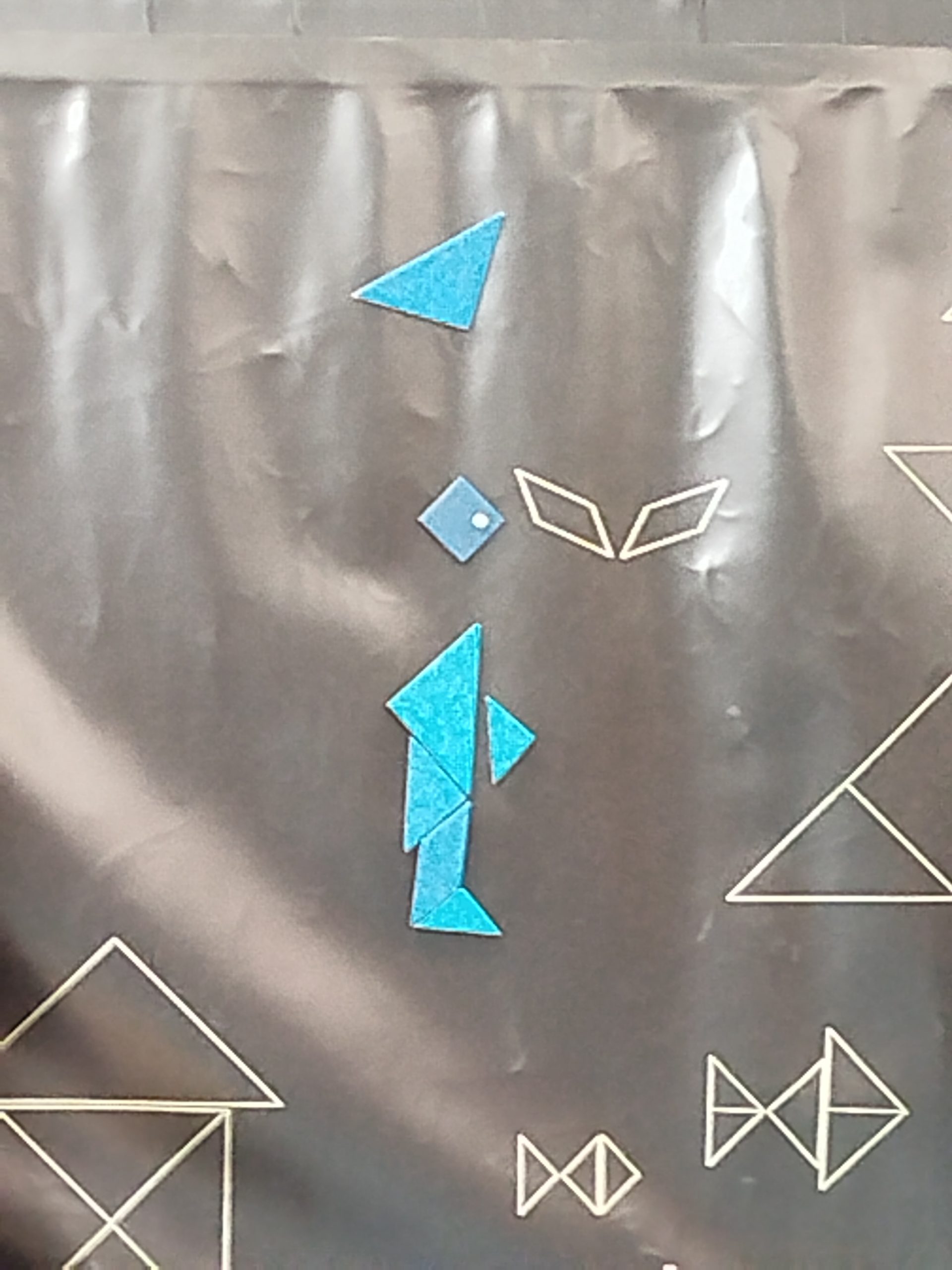 Jeudi 13 novembre, les MS et GS ont pu rencontrer deux artistes de la compagnie Boi’brut, en lien avec le spectacle “Karl” vu avant les vacances à Montrelais dans le cadre du festival “Ce soir, je sors mes parents”. Elles ont fait reformuler les grandes étapes du spectacle. Elles étaient très contentes car les élèves se souvenaient de tous les détails. Ensuite, comme Karl “personnage tangrams”, les élèves ont eu la possibilité de reconstituer une fresque, représentant les personnages de l’histoire à l’aide de morceaux de tangrams (la baleine, le phare, le palmier, les mouettes,…)