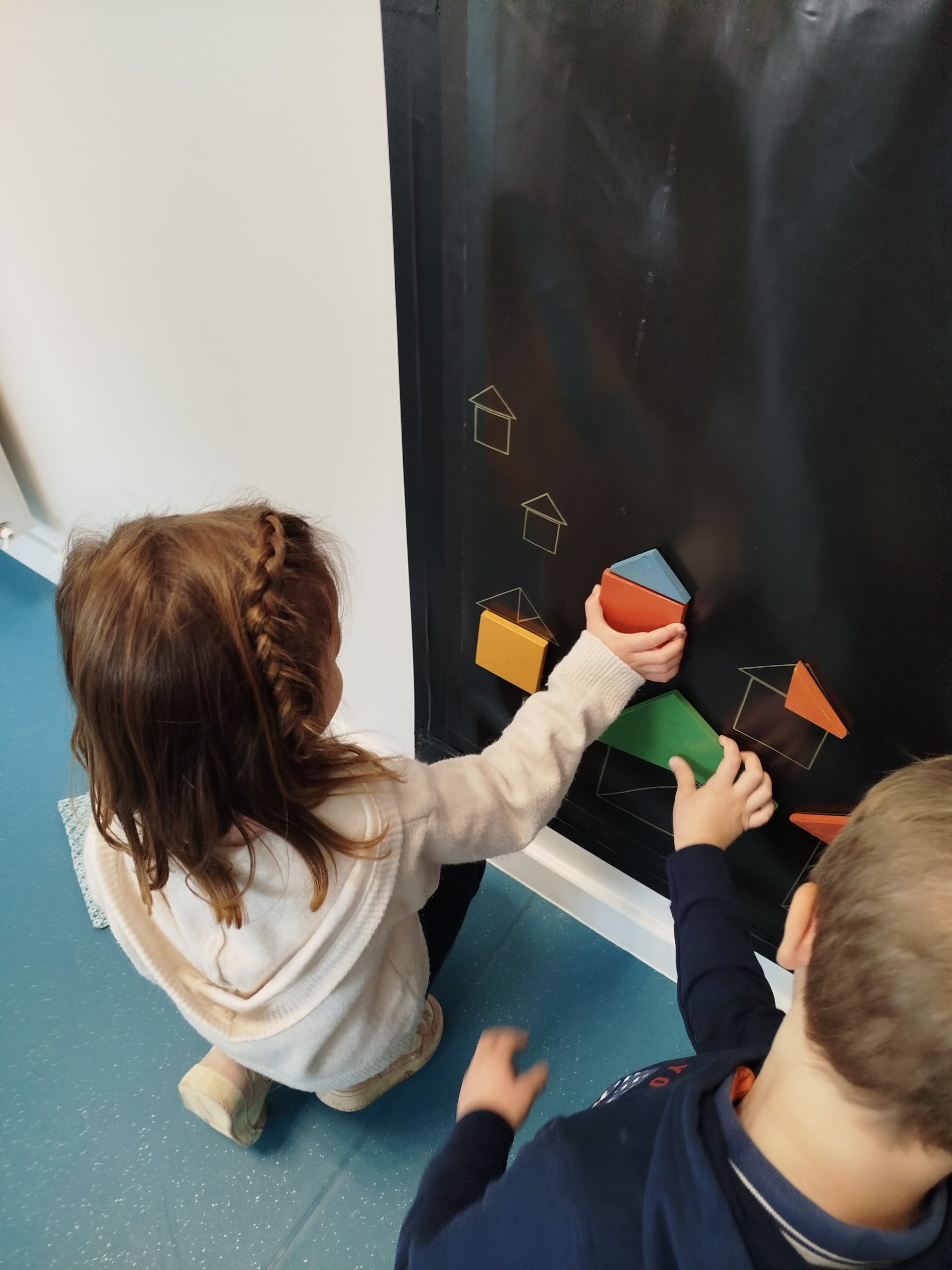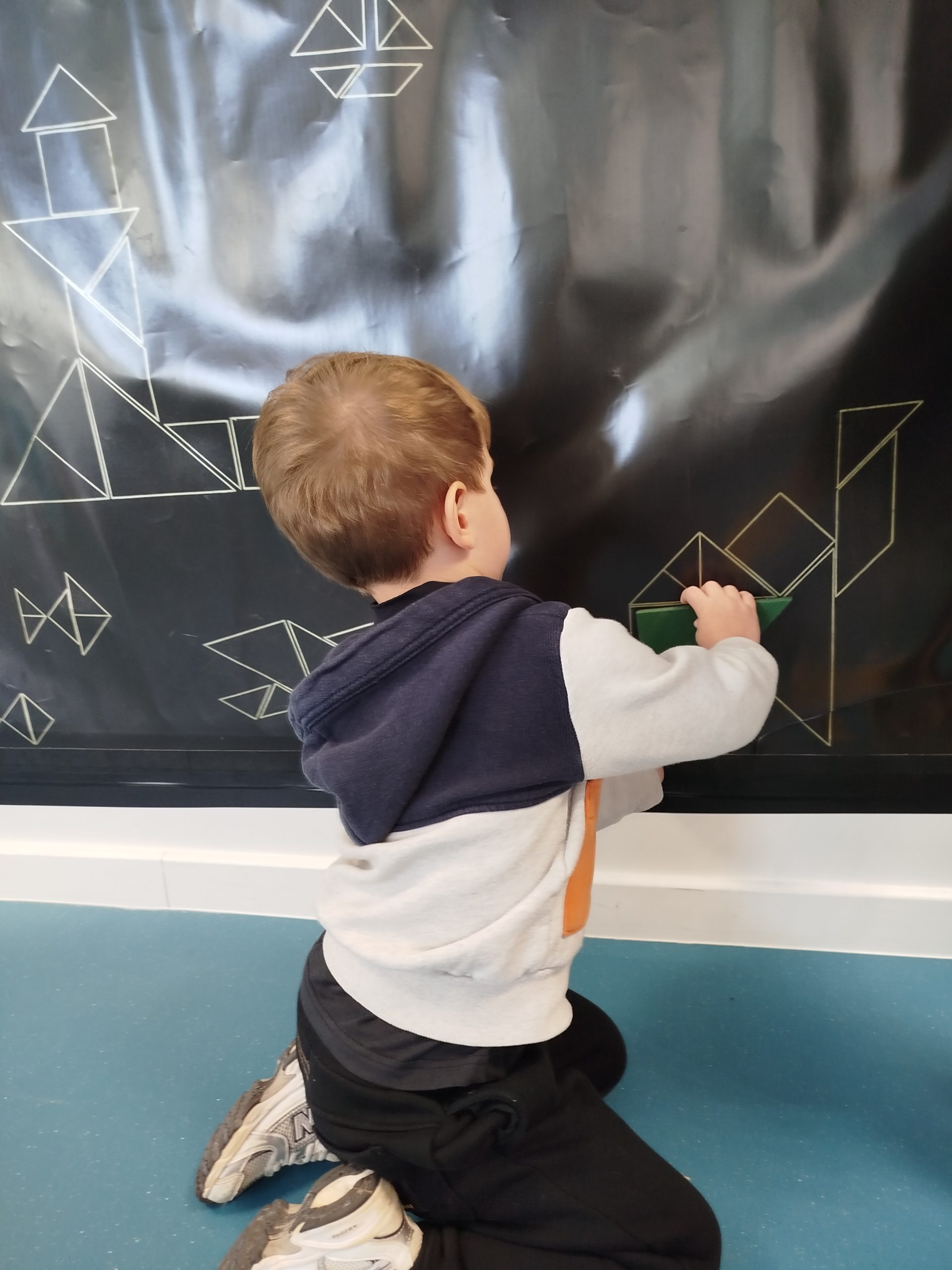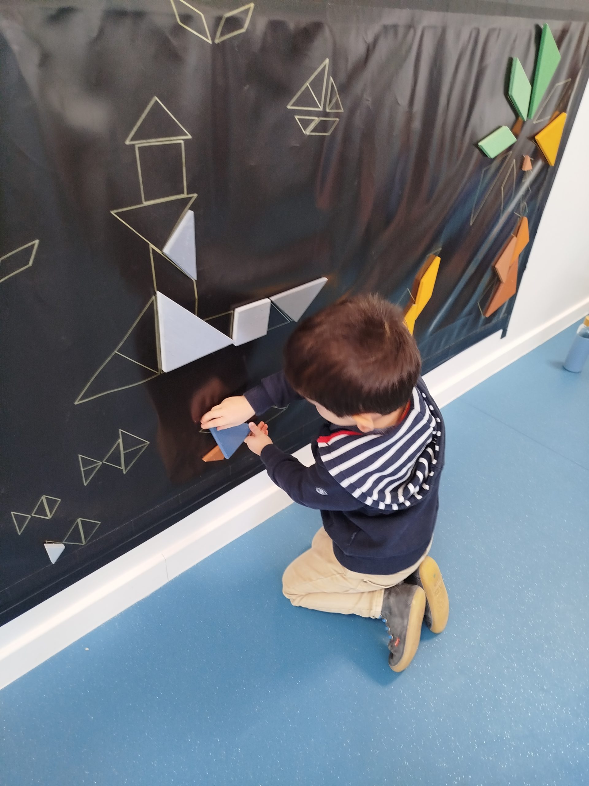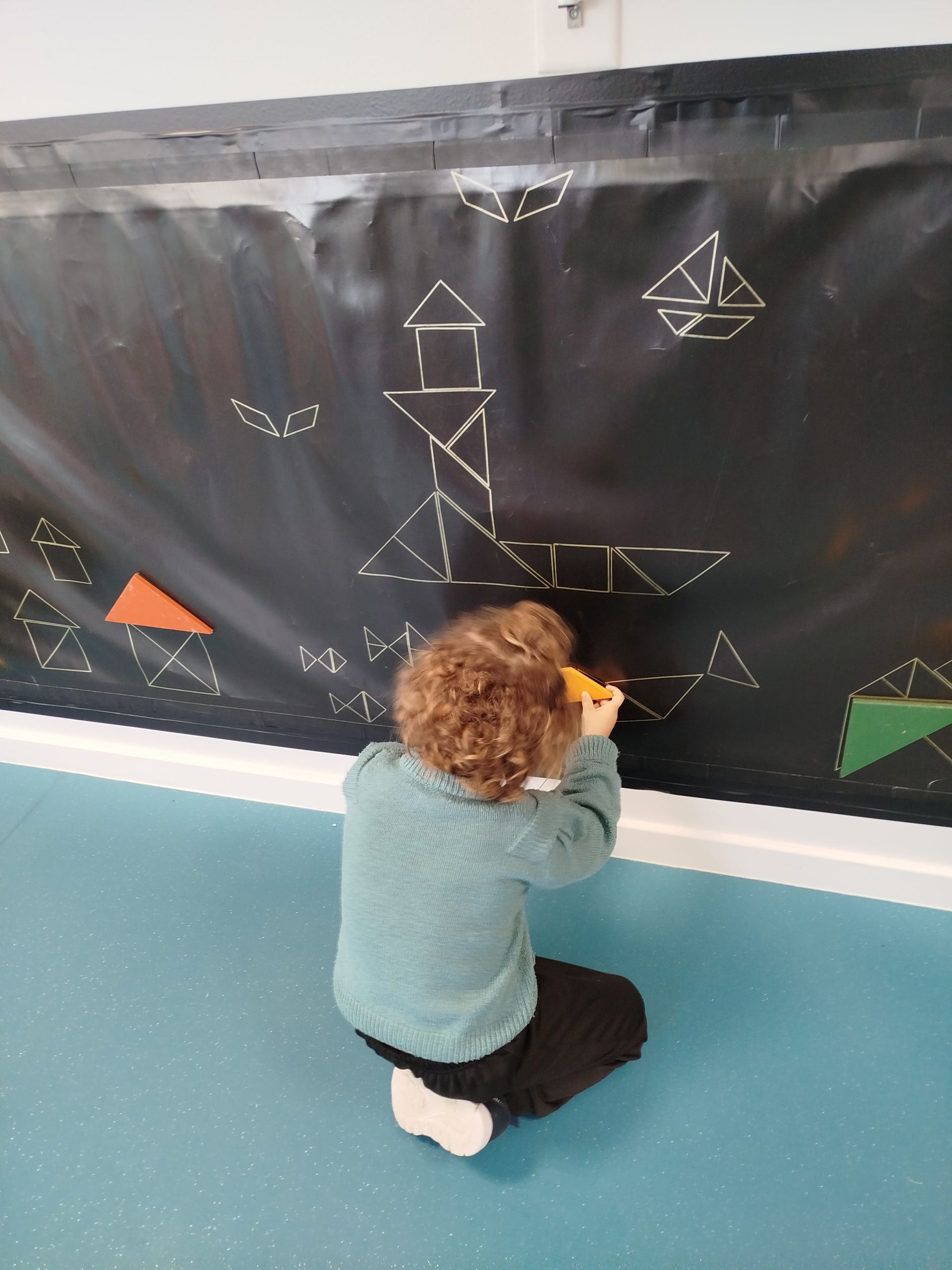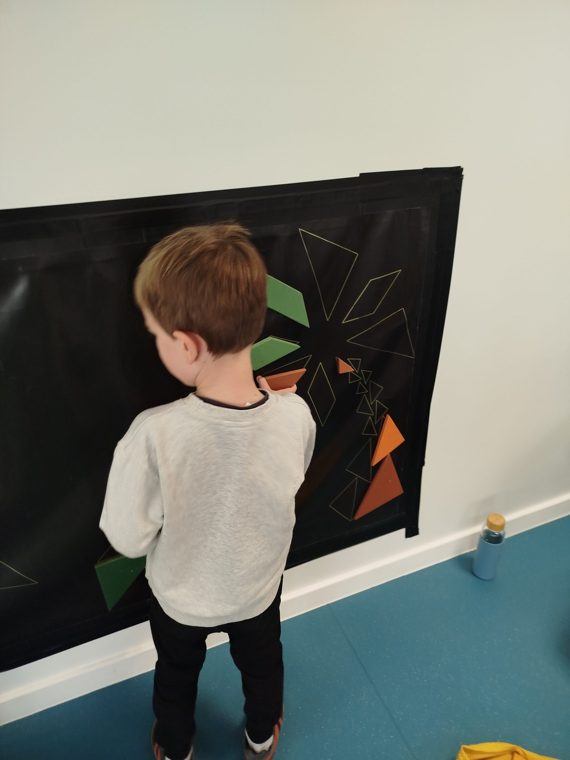 Jeudi 13 novembre, les MS et GS ont pu rencontrer deux artistes de la compagnie Boi’brut, en lien avec le spectacle “Karl” vu avant les vacances à Montrelais dans le cadre du festival “Ce soir, je sors mes parents”. Elles ont fait reformuler les grandes étapes du spectacle. Elles étaient très contentes car les élèves se souvenaient de tous les détails. Ensuite, comme Karl “personnage tangrams”, les élèves ont eu la possibilité de reconstituer une fresque, représentant les personnages de l’histoire à l’aide de morceaux de tangrams (la baleine, le phare, le palmier, les mouettes,…)