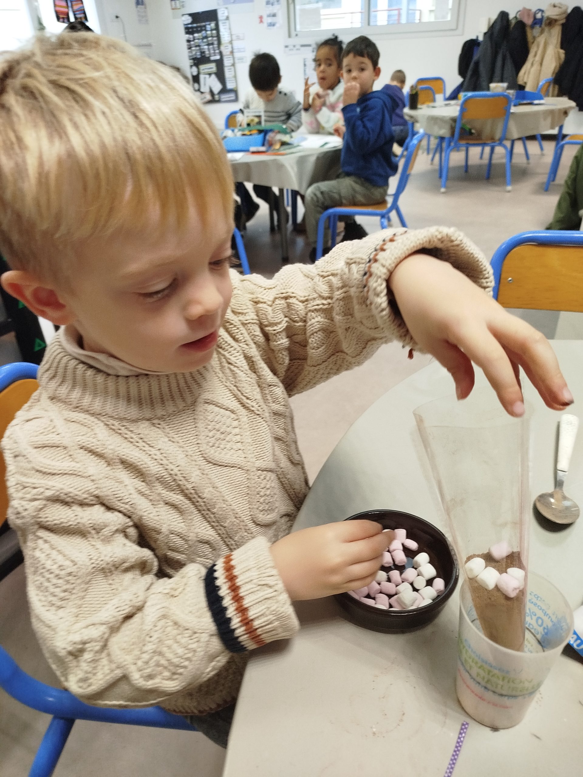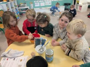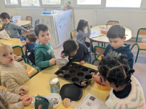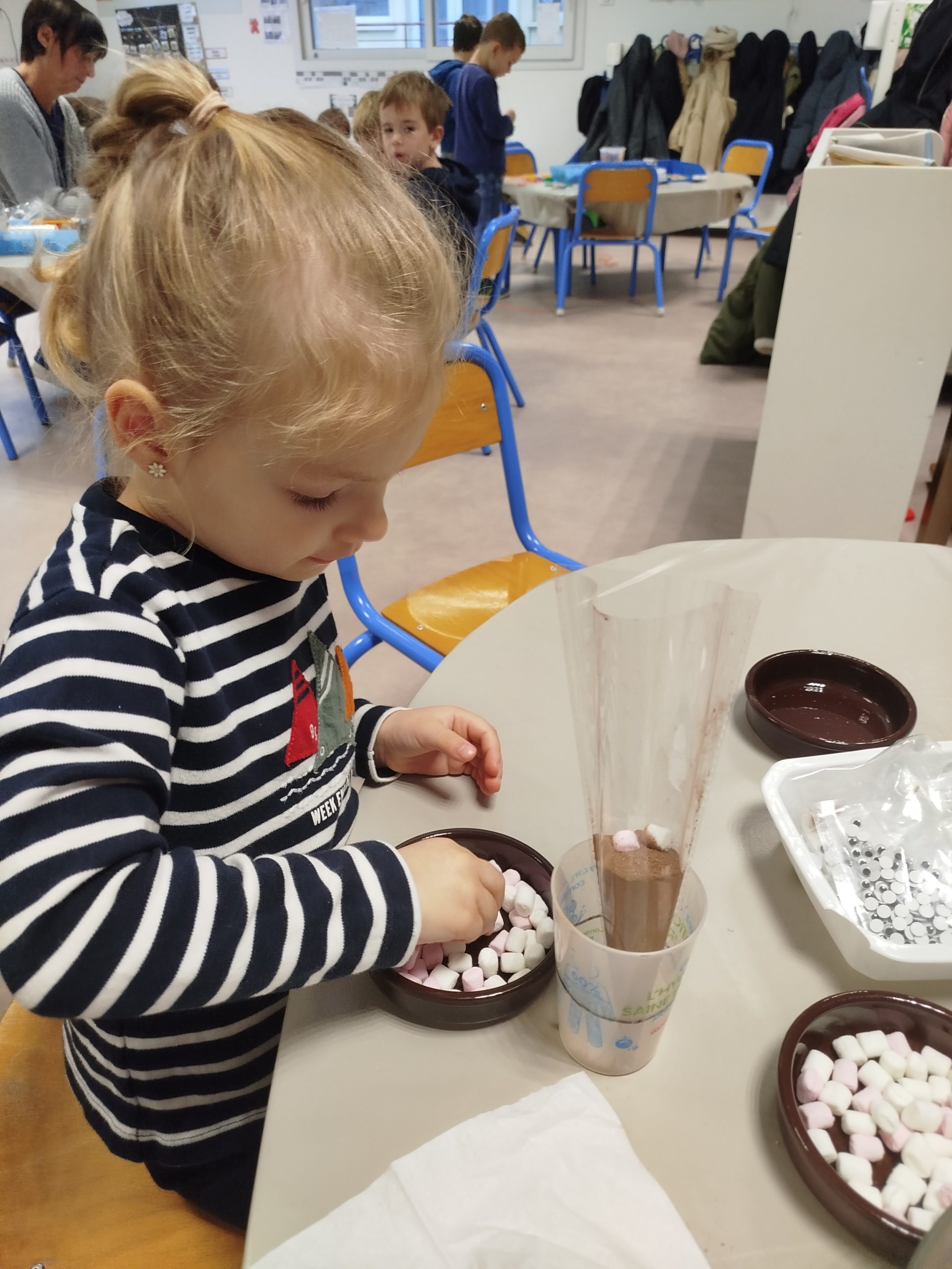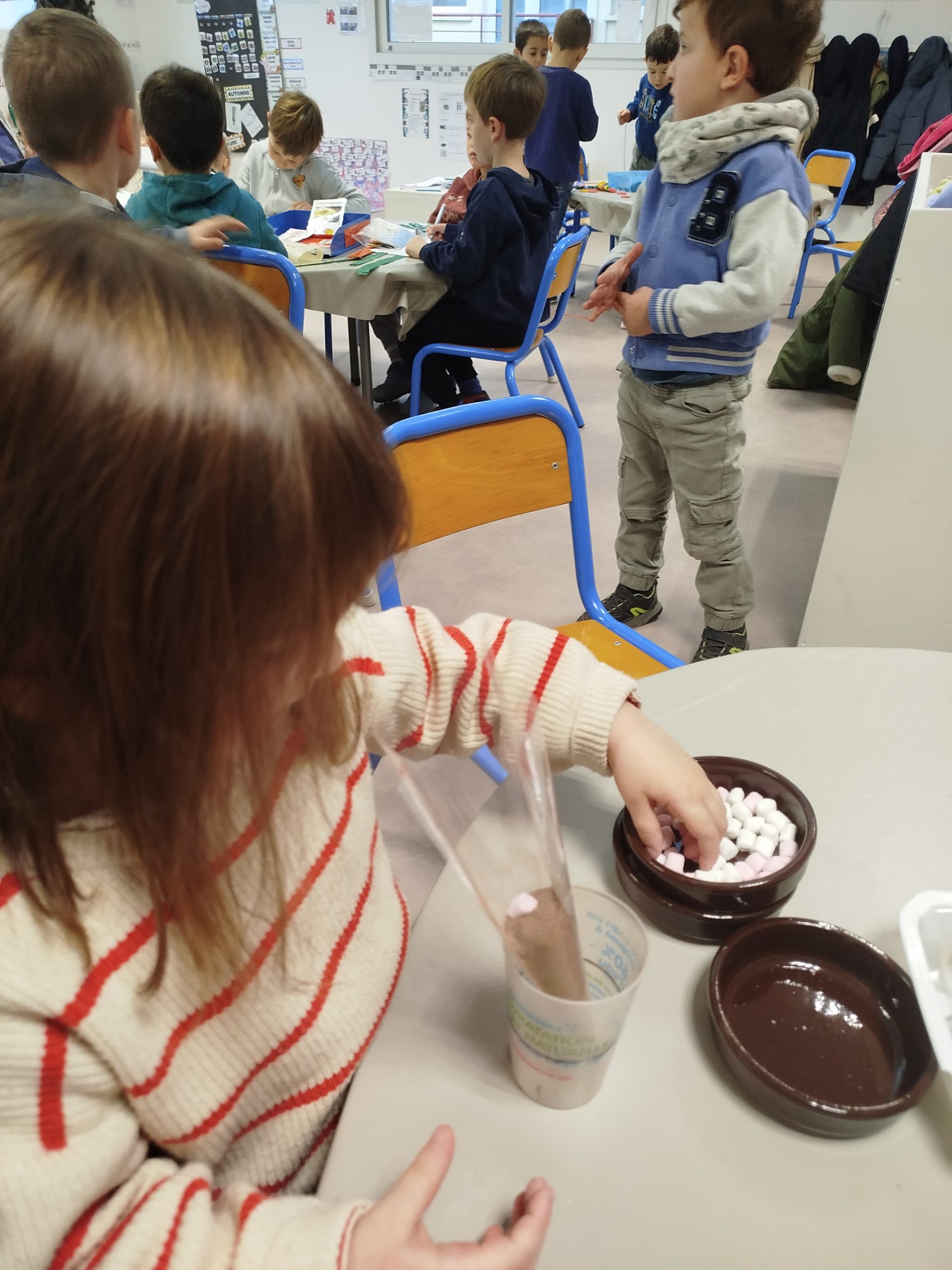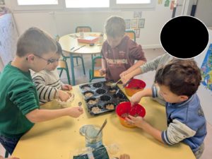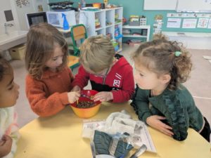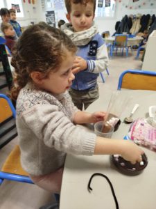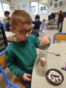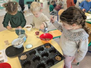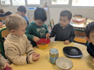Jeudi 27 novembre, nous avons préparé le marché de Noël de l’école. Au programme: fabrication de mangeoires pour oiseaux, avec de l’huile de coco et des graines, dans la classe de Carine, pour les MS et GS. Puis, dans la classe de Nadège, réalisation de cornets “cacao et guimauves” à mettre dans du lait chaud, pour les PS et GS.