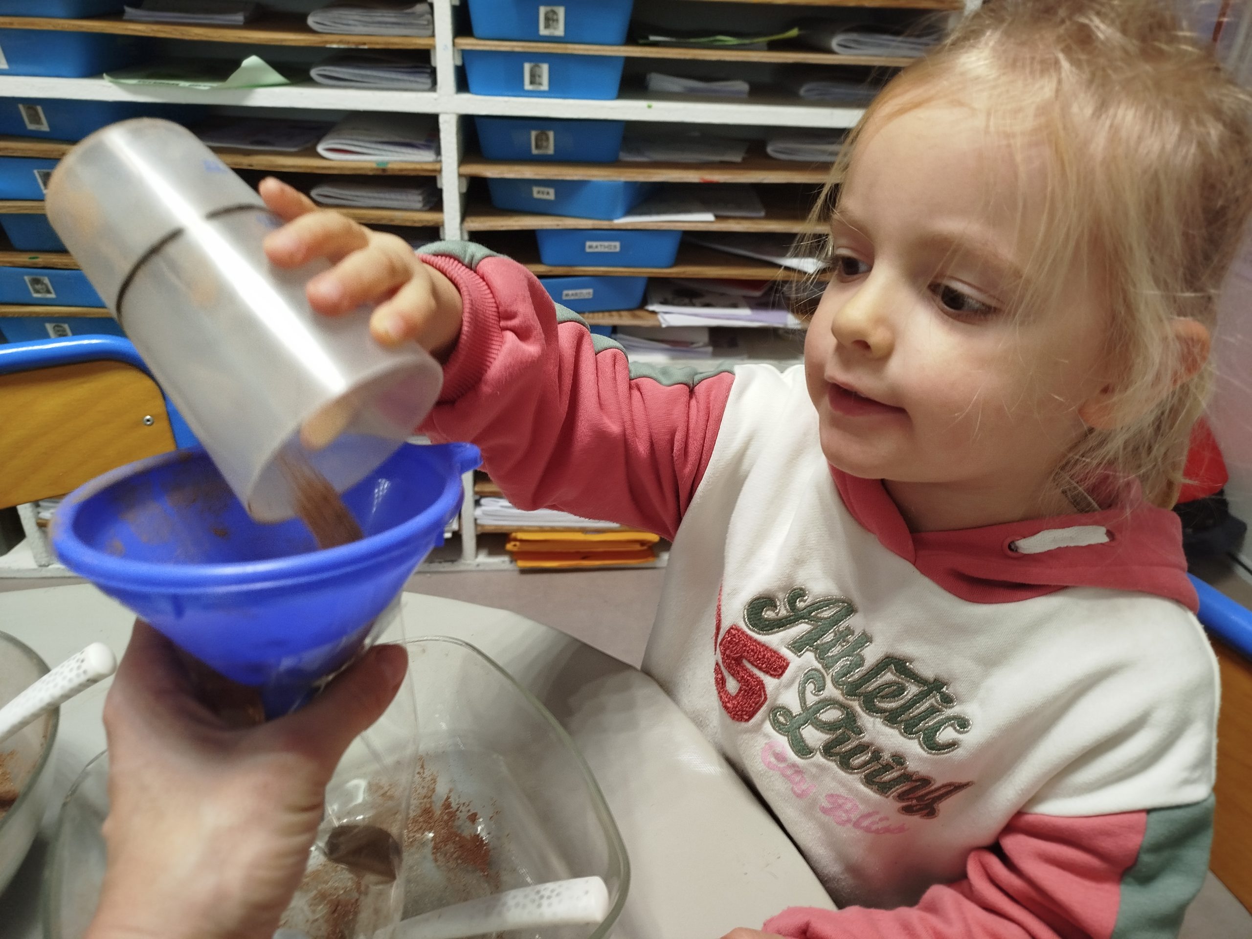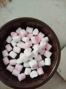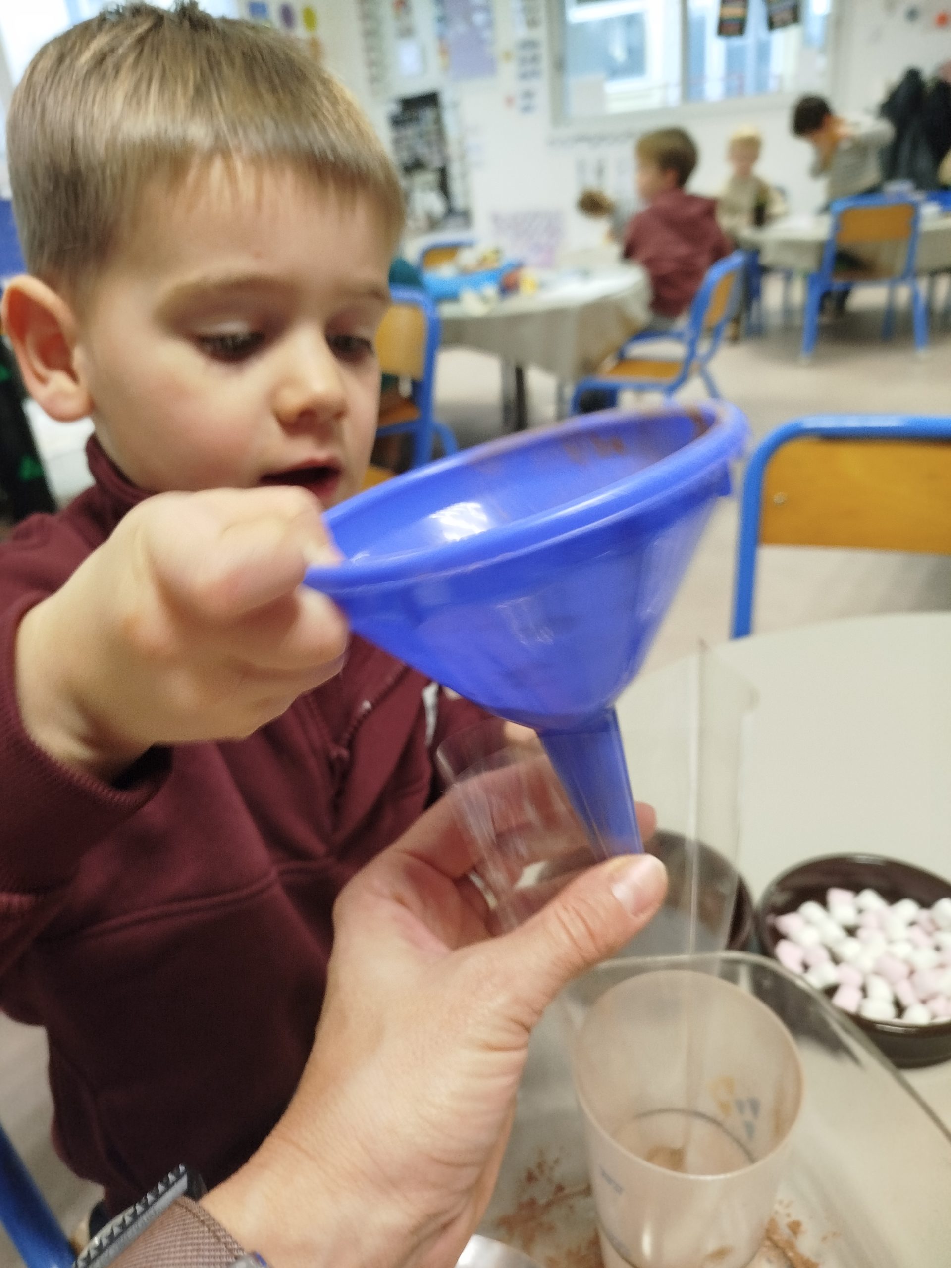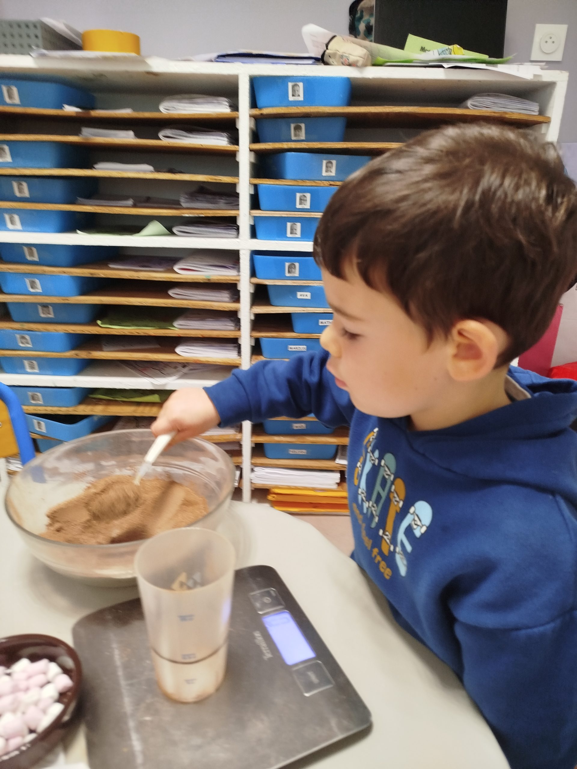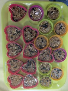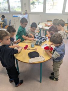 Jeudi 27 novembre, nous avons préparé le marché de Noël de l’école. Au programme: fabrication de mangeoires pour oiseaux, avec de l’huile de coco et des graines, dans la classe de Carine, pour les MS et GS. Puis, dans la classe de Nadège, réalisation de cornets “cacao et guimauves” à mettre dans du lait chaud, pour les PS et GS.