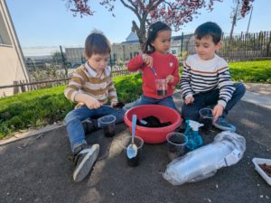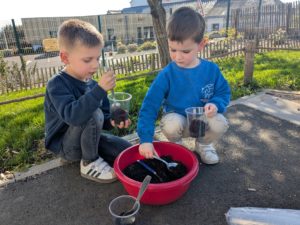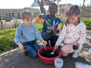 Chaque élève de la classe a pu planter, deux graines de haricot, dans du terreau. Il fallait mettre du terreau dans le pot à l’aide d’une cuillère, puis, enfoncer les deux graines avec ses doigts et enfin arroser avec le pulvérisateur.