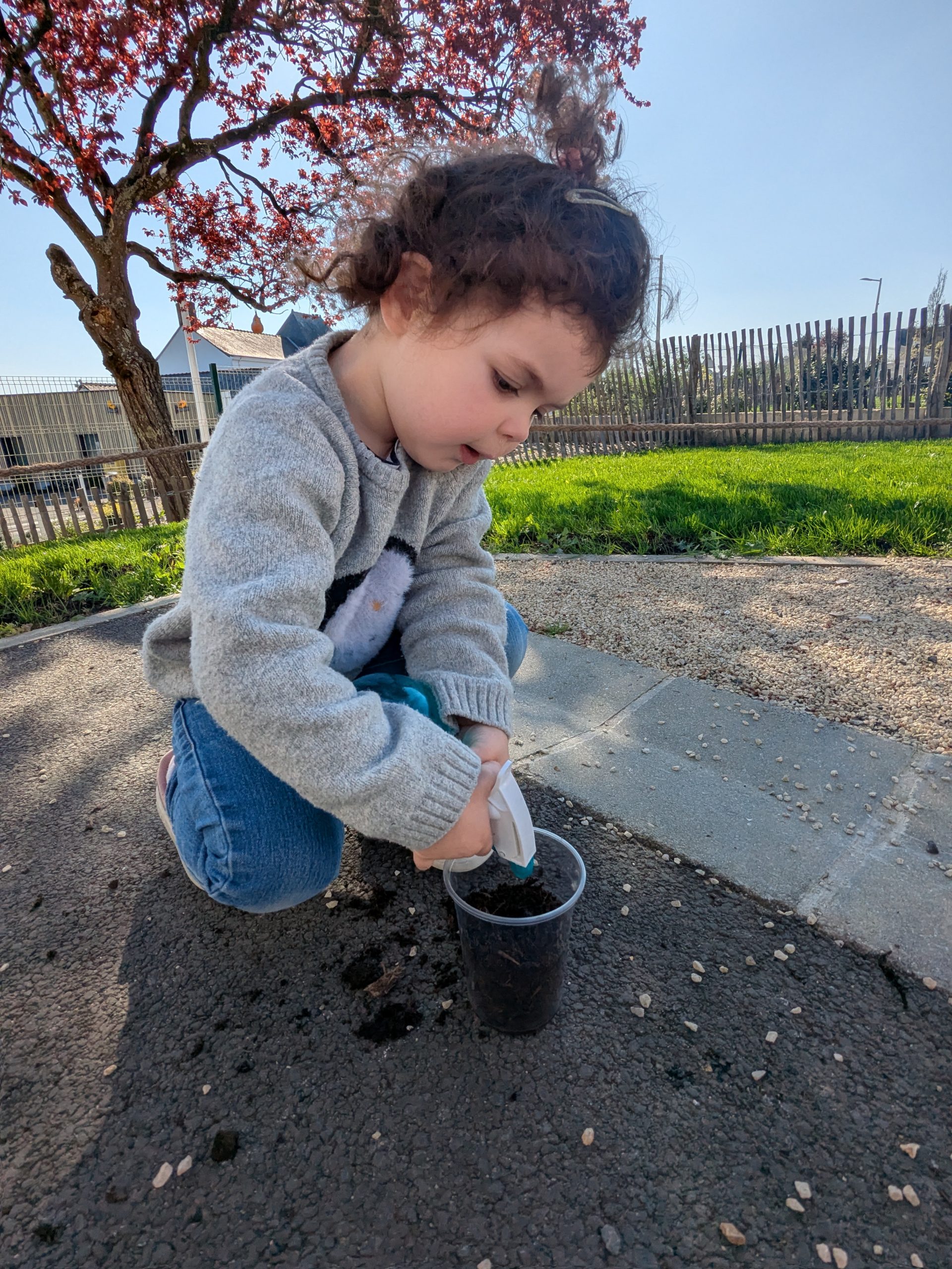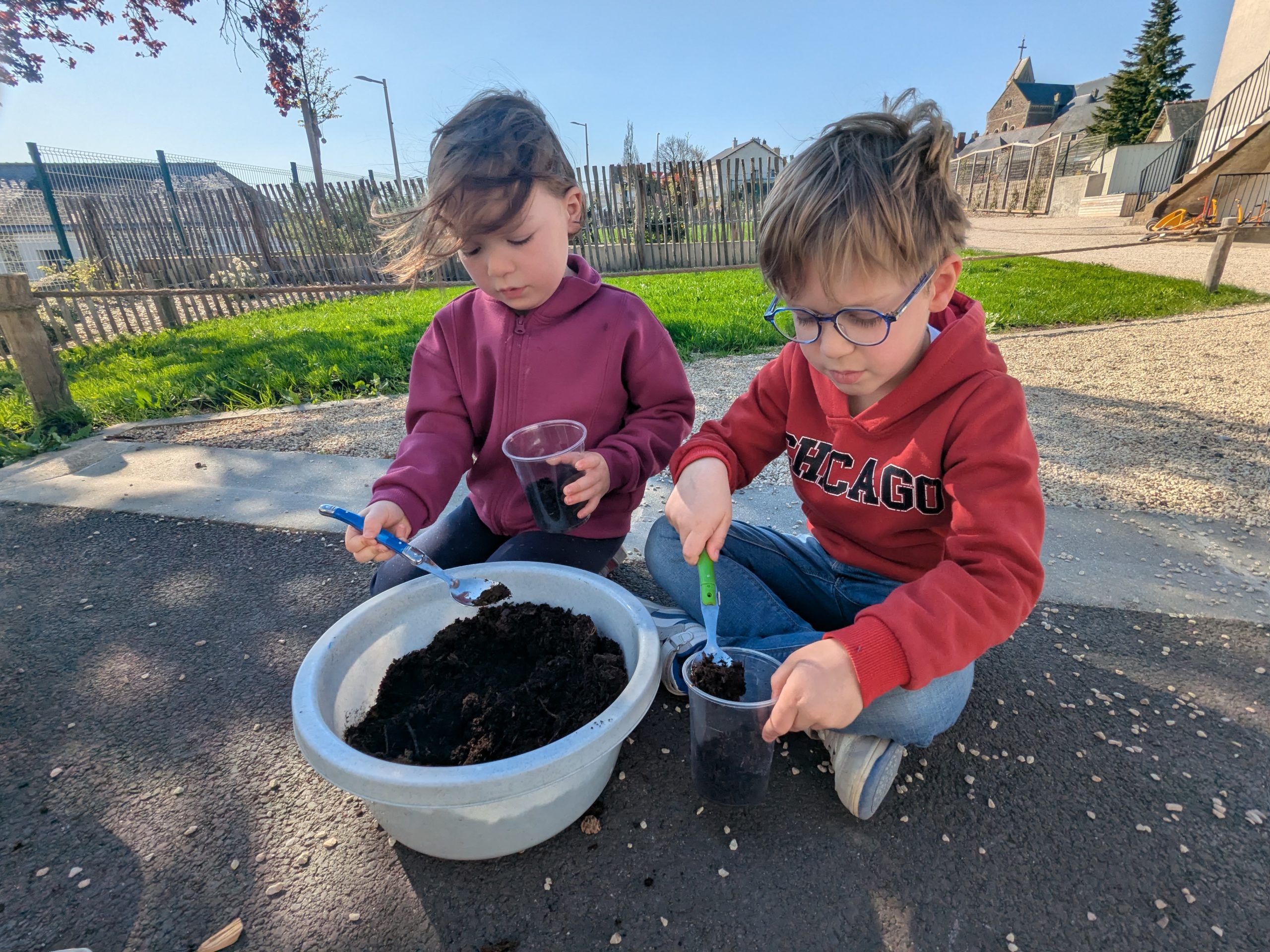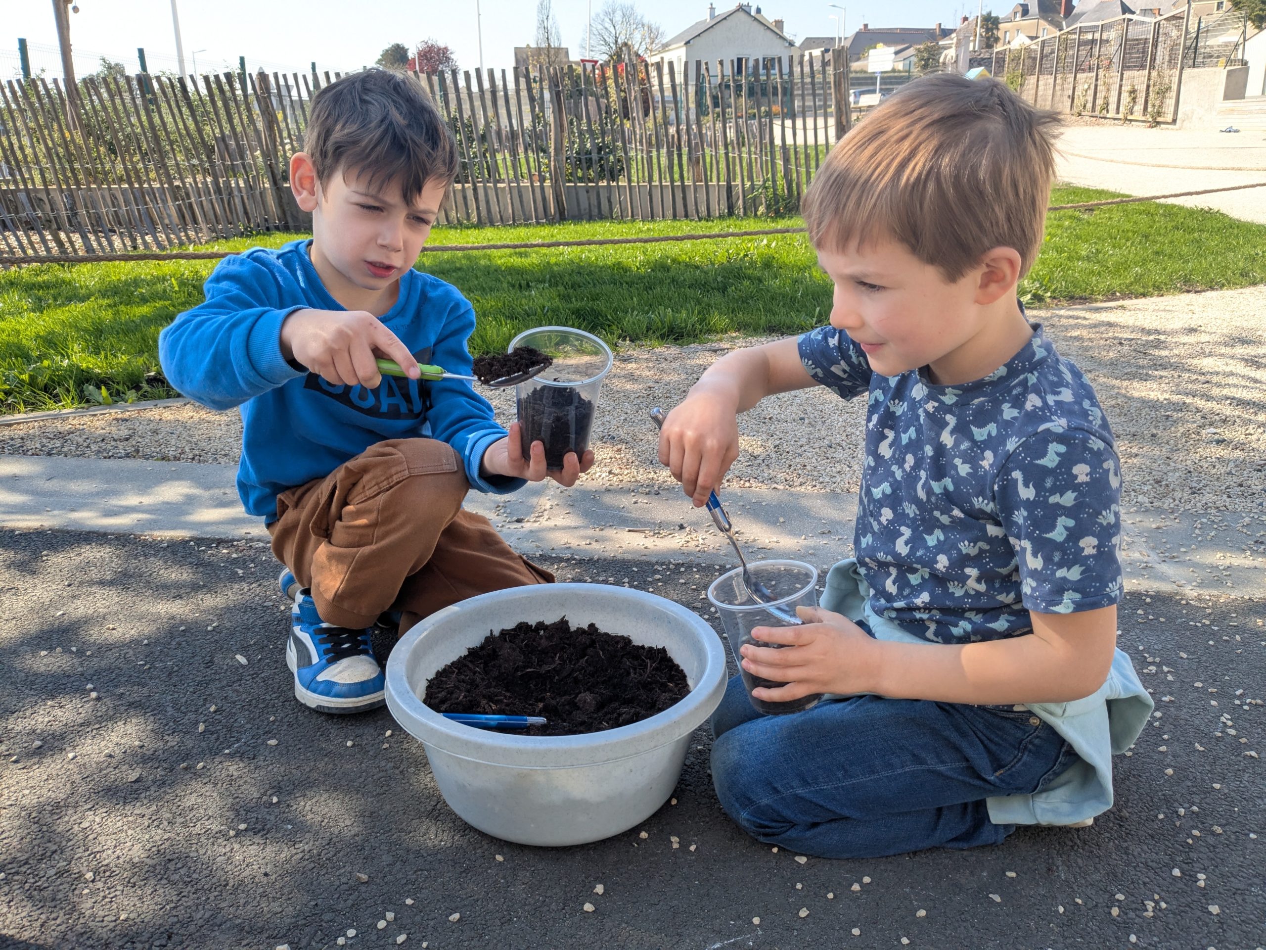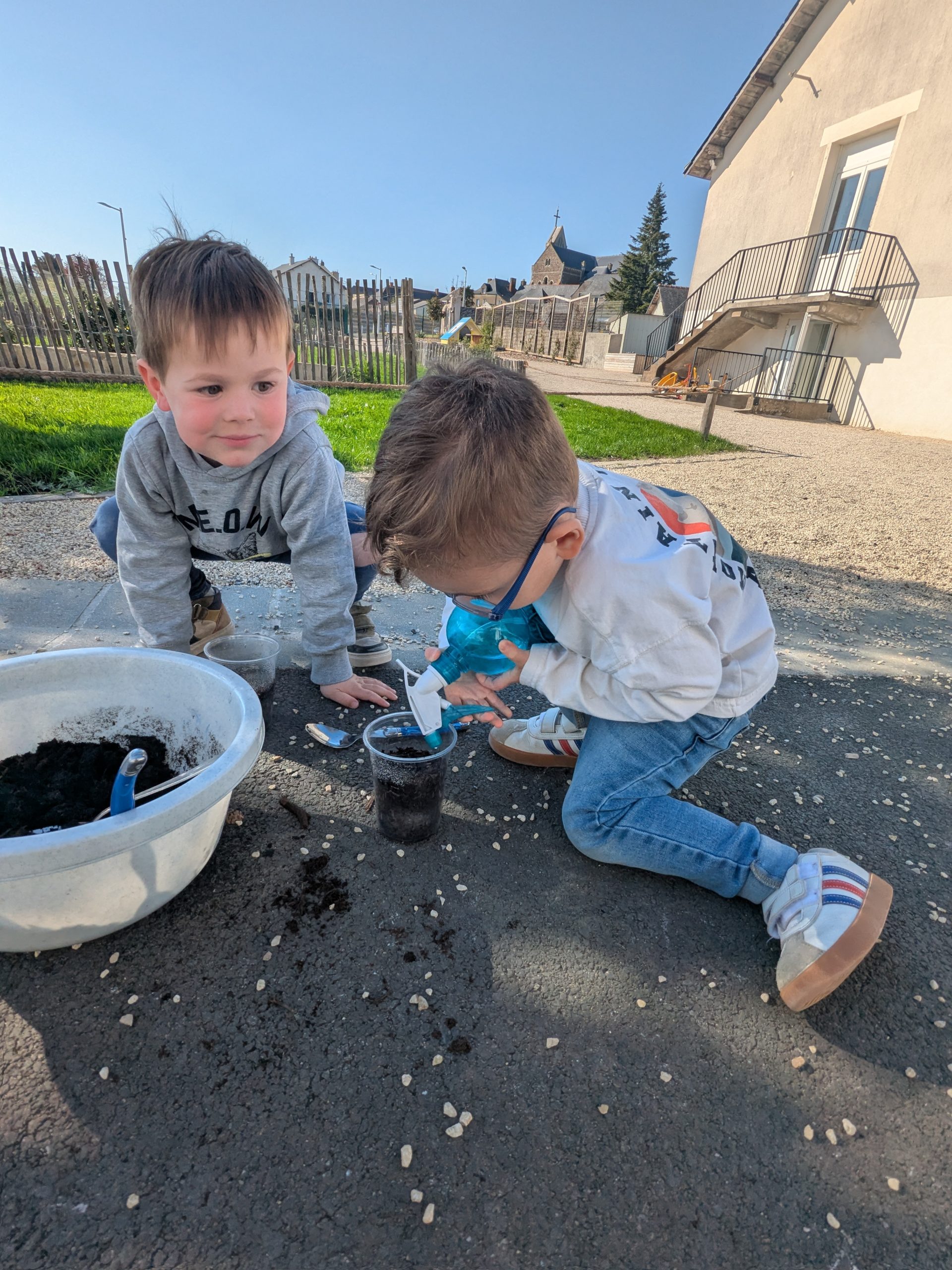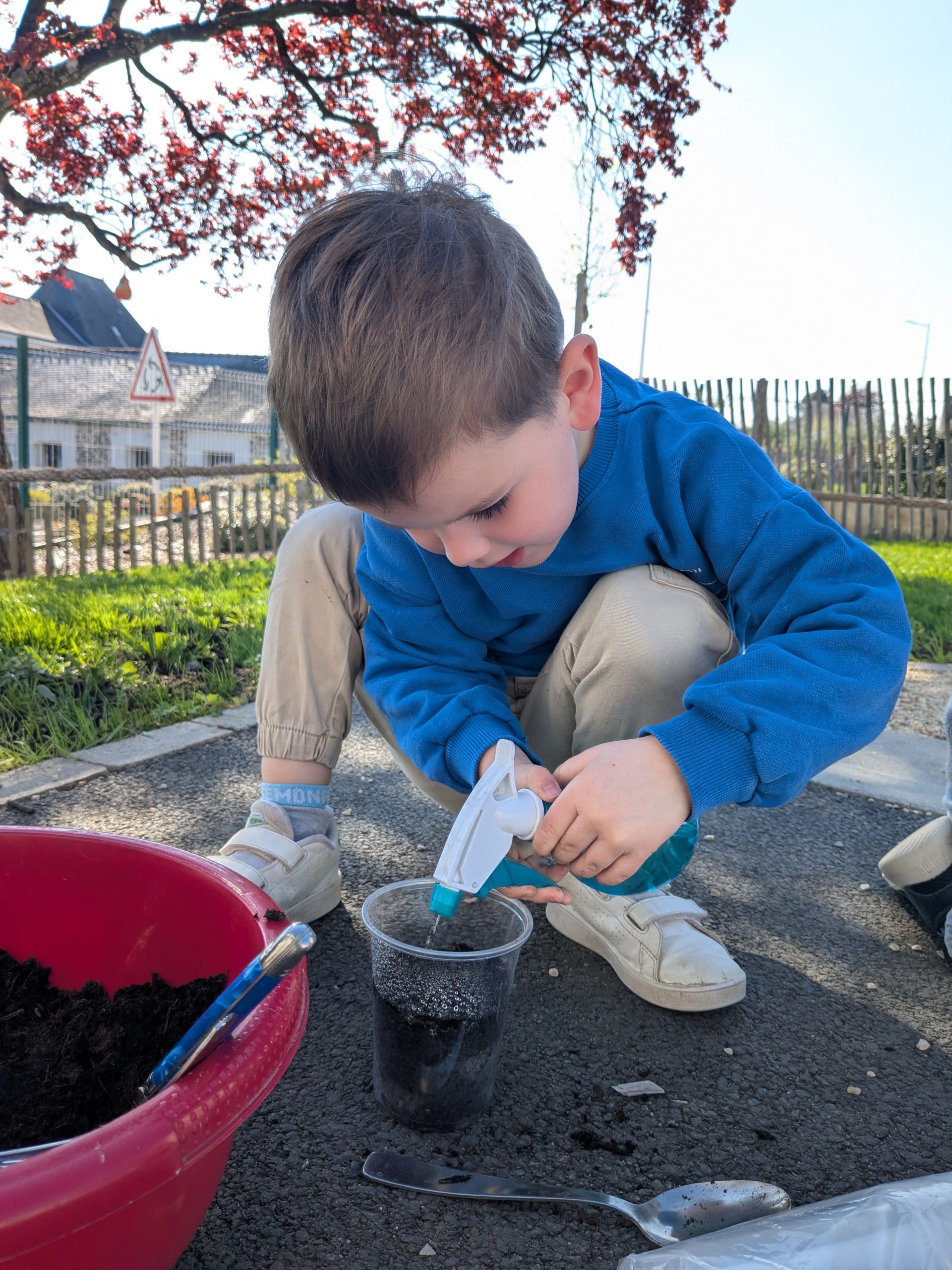 Chaque élève de la classe a pu planter, deux graines de haricot, dans du terreau. Il fallait mettre du terreau dans le pot à l’aide d’une cuillère, puis, enfoncer les deux graines avec ses doigts et enfin arroser avec le pulvérisateur.