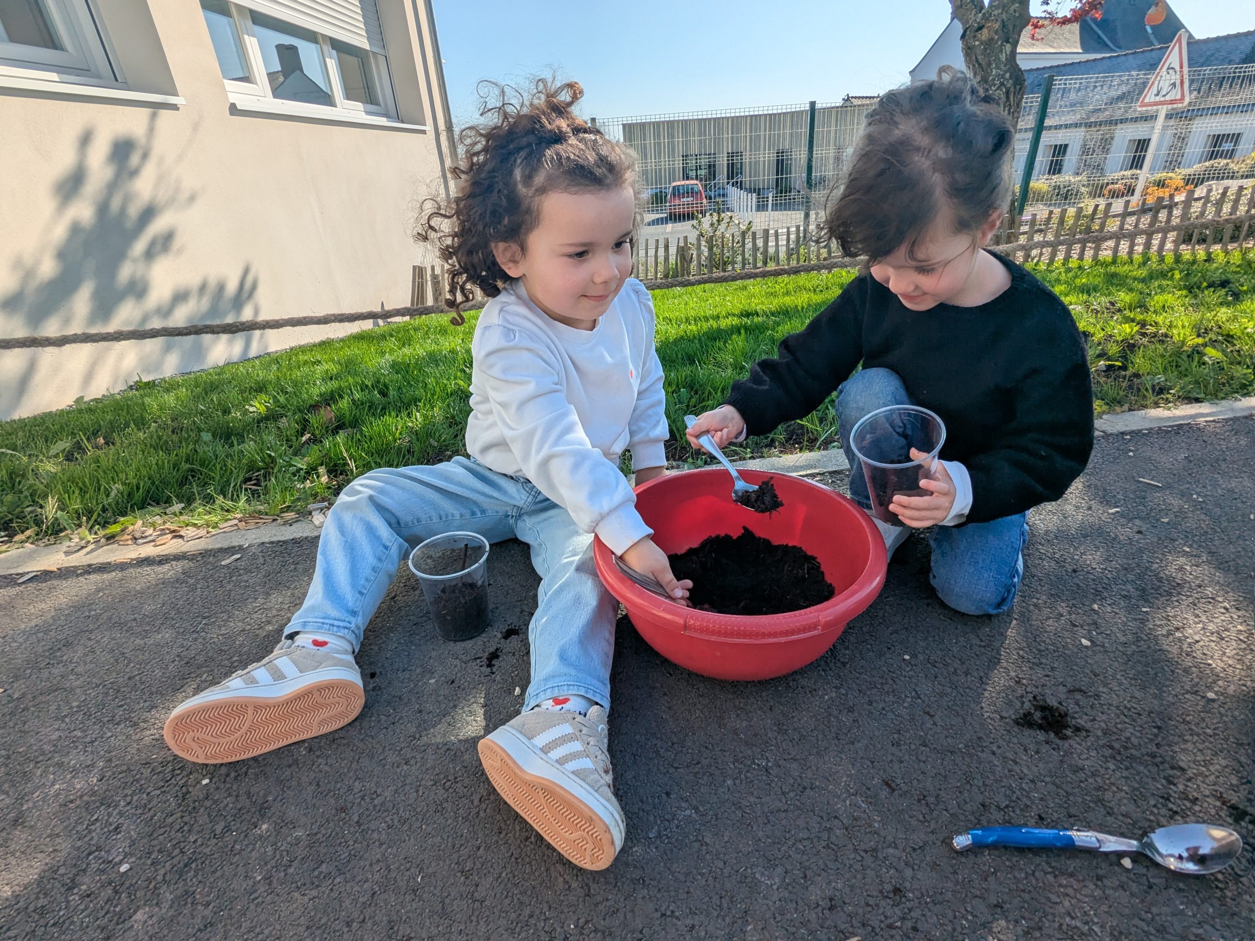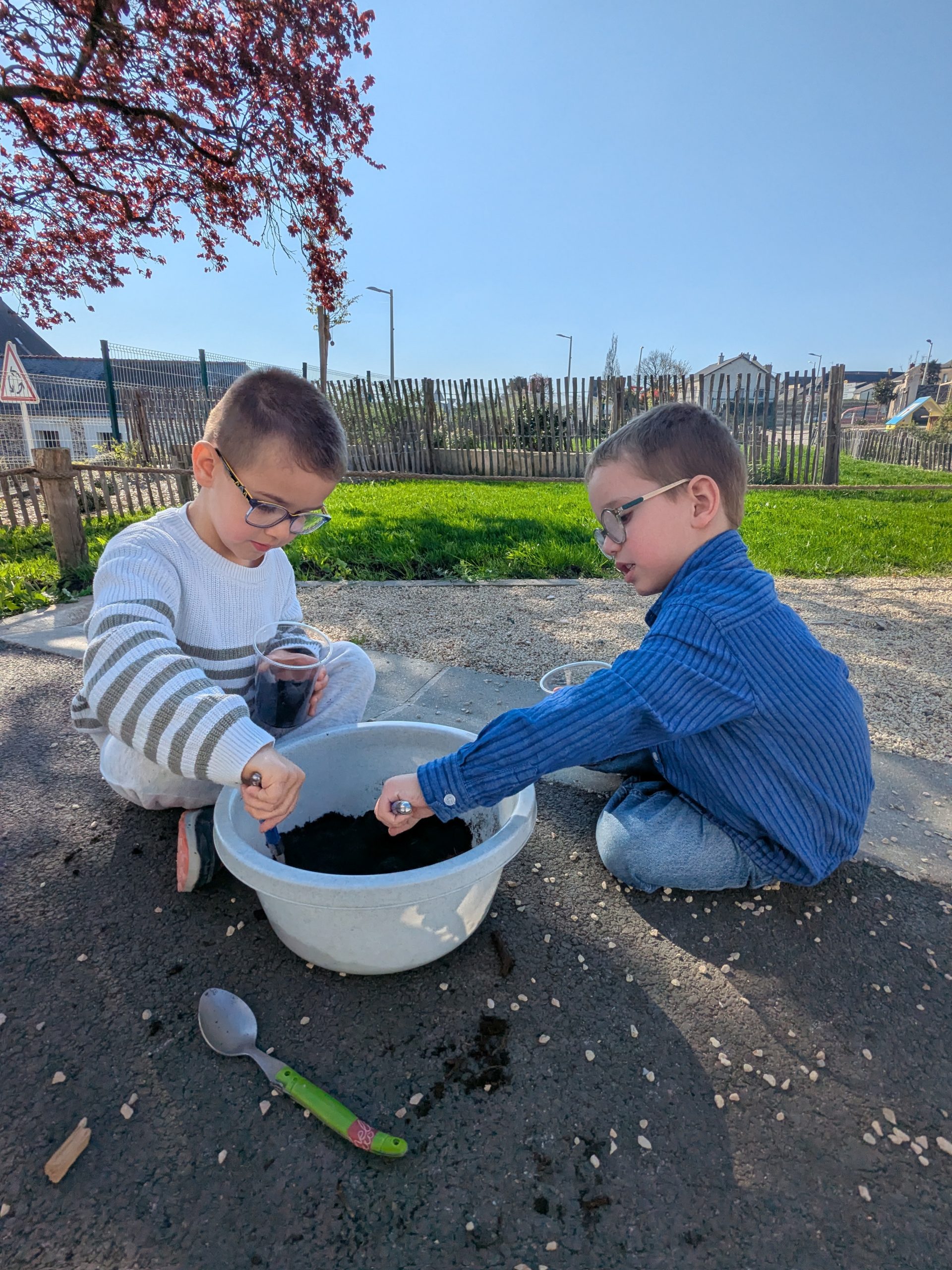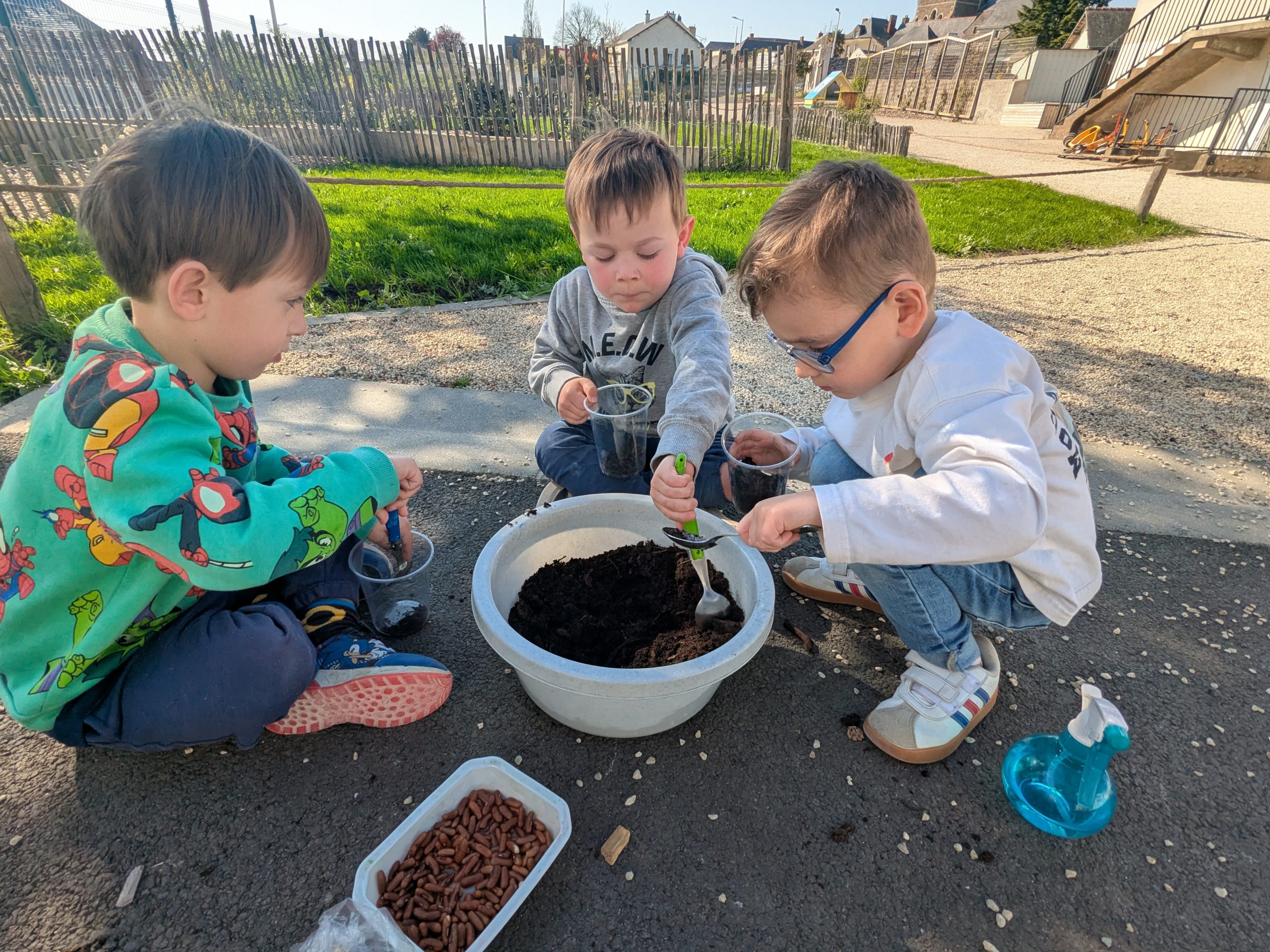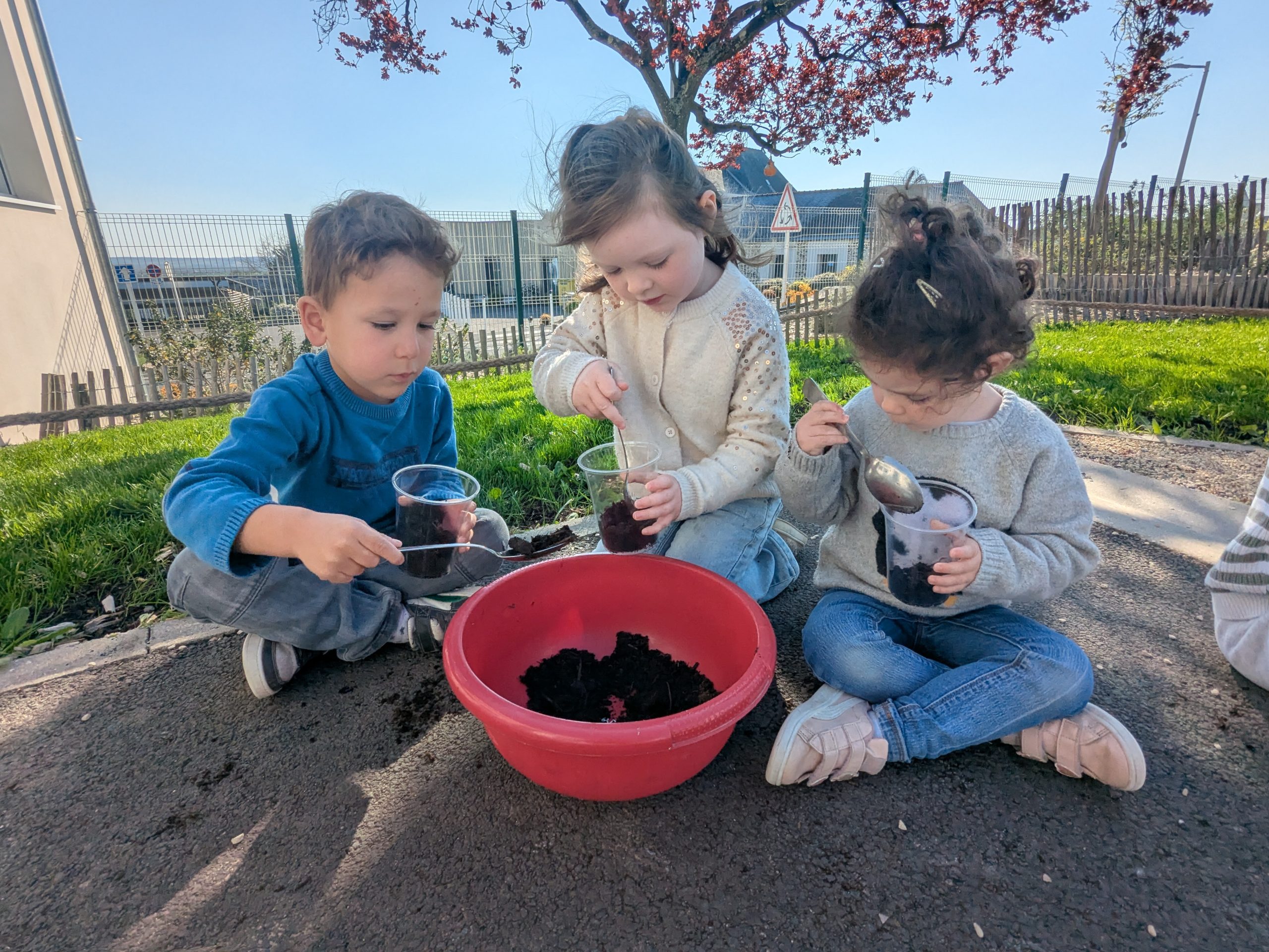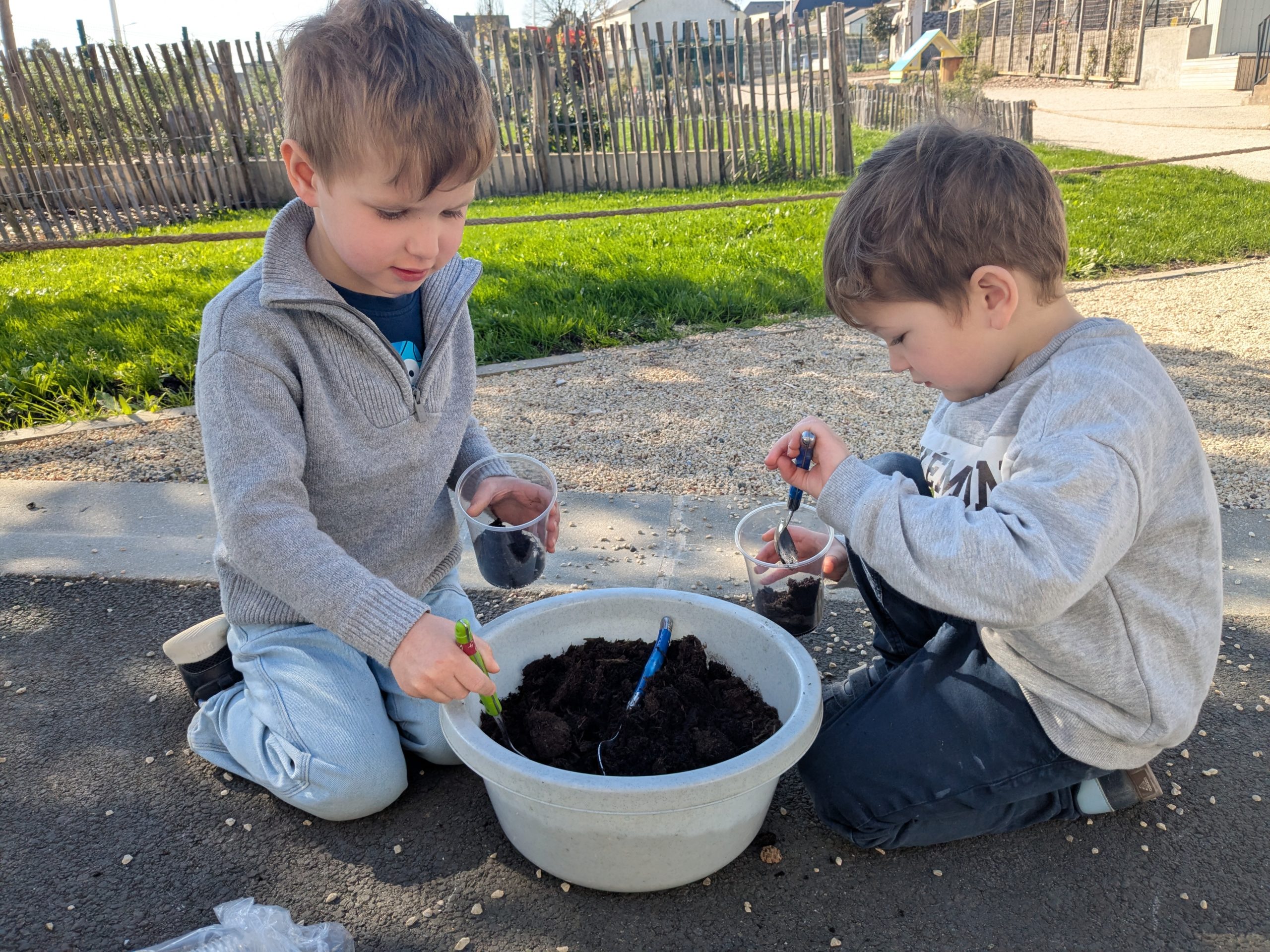 Chaque élève de la classe a pu planter, deux graines de haricot, dans du terreau. Il fallait mettre du terreau dans le pot à l’aide d’une cuillère, puis, enfoncer les deux graines avec ses doigts et enfin arroser avec le pulvérisateur.